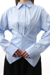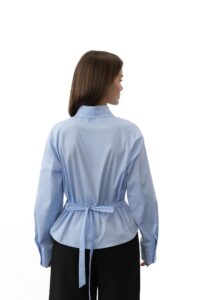 Сучасна сорочка в смужку поєднує класику та трендовий дизайн. Модель має ґудзики по всій довжині та зовнішню застібку зсередини, що робить пошив унікальним. Довгі стрічки додають акцент і дозволяють грати зі силуетом, підкреслюючи ефект корсета, який моделює талію та додає образу жіночності