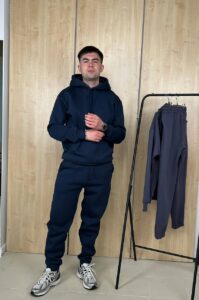 Флісовий костюм для чоловіків: худі з капюшоном і передньою кишенею та джогери з еластичним поясом і кишенями. Практичний та стильний вибір для міста, подорожей і спорту.
