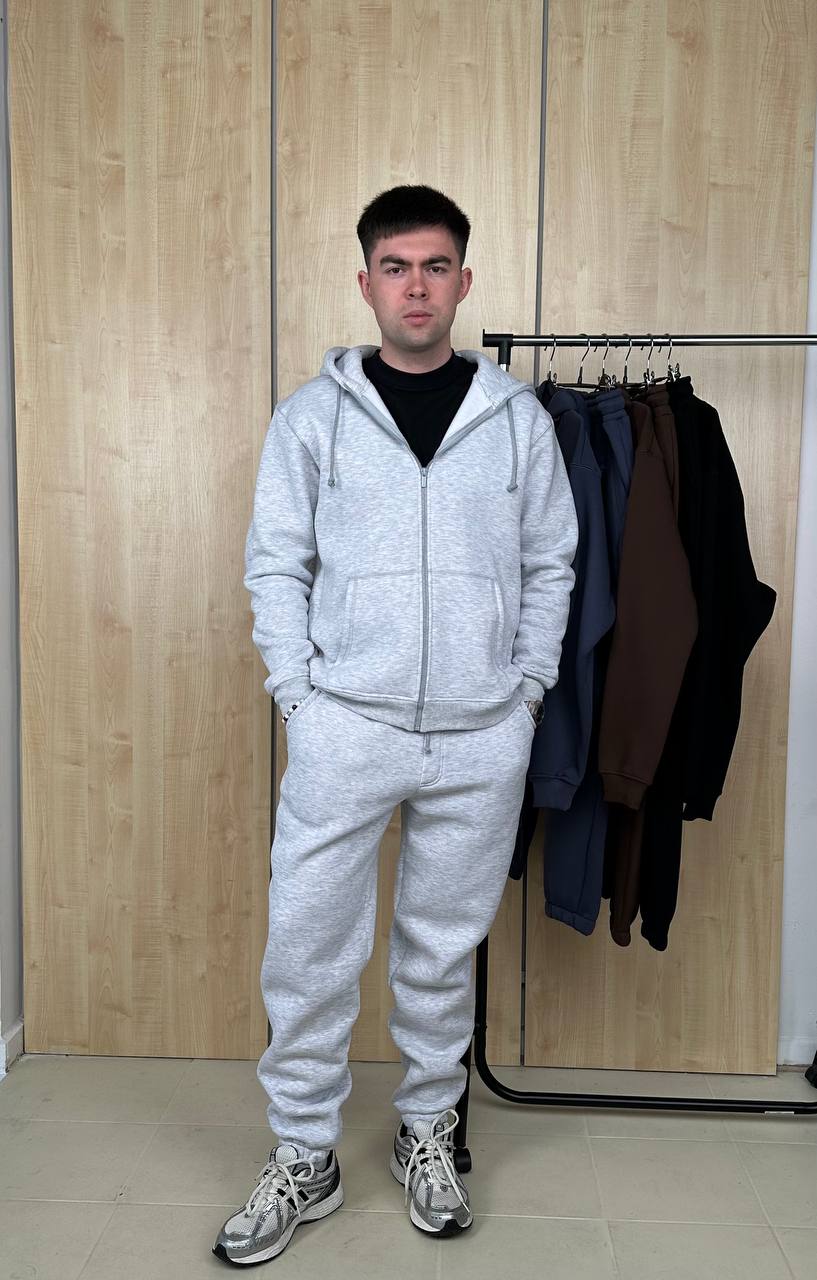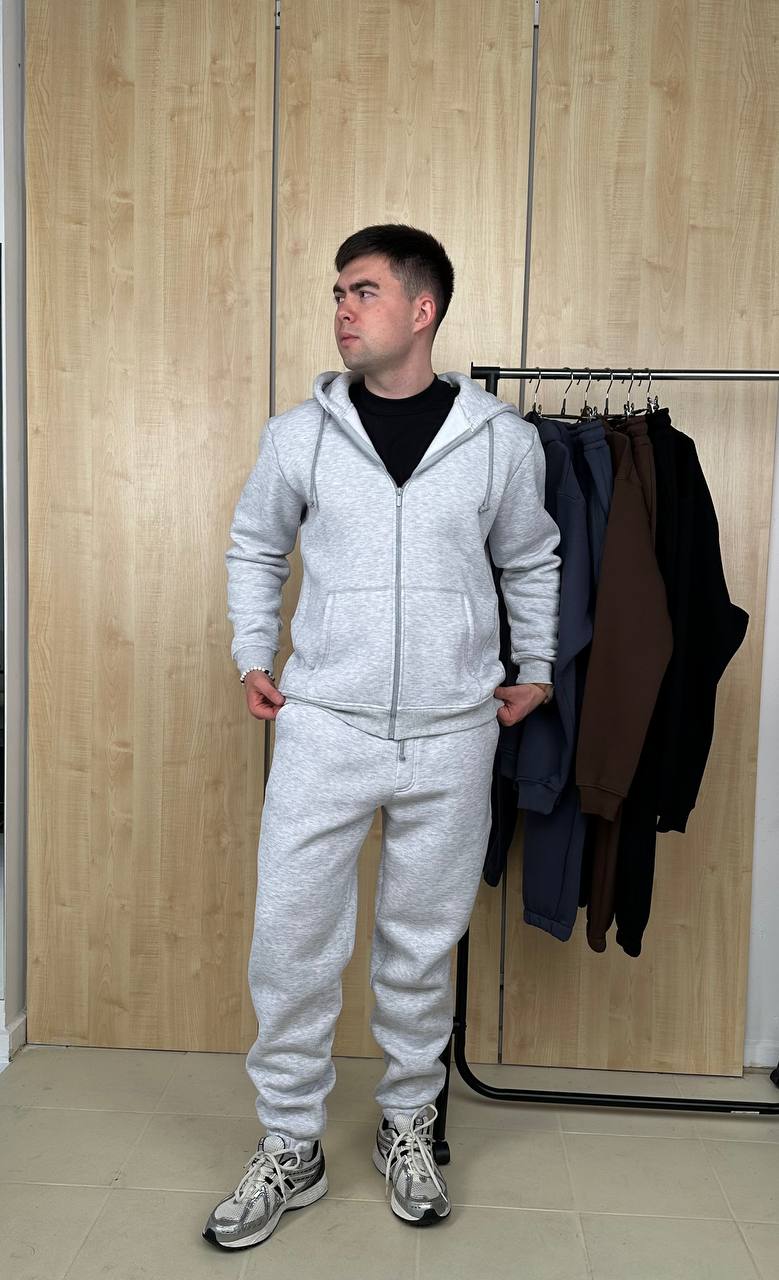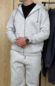 Теплий та комфортний костюм із високоякісної бавовни та з м’яким утеплювачем. Кофта вільного крою на блискавці з капюшоном, штани оснащені кишенями на еластичному поясі і резинкою знизу для зручної посадки. Ідеальний для повсякденного носіння та активного відпочинку.