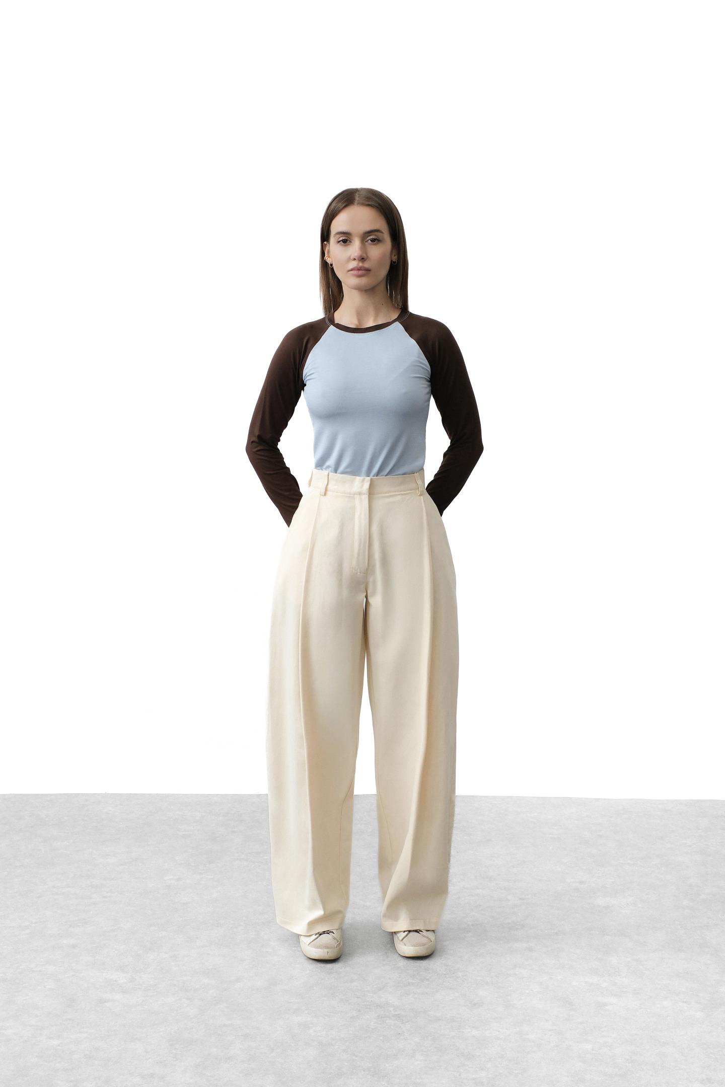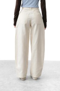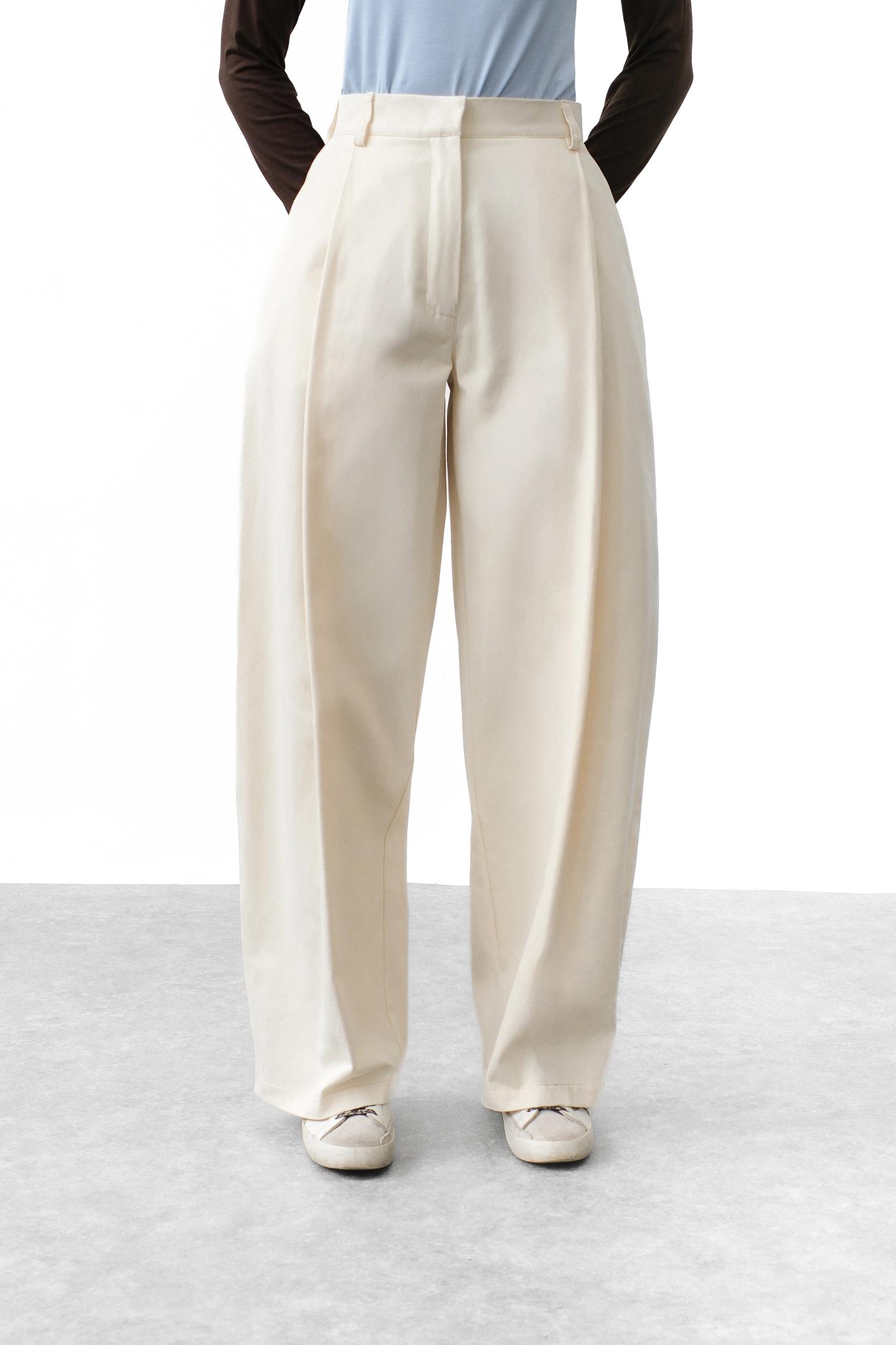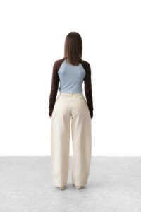 Джинси палаццо — сучасна база, яка підкреслює талію та візуально витягує силует. Особливим акцентом виступають защипи, які формують трендовий силует і роблять посадку ще більш виразною. Вільний крій із широкими штанинами додає образу легкості та відкриває безліч варіантів стилізації
