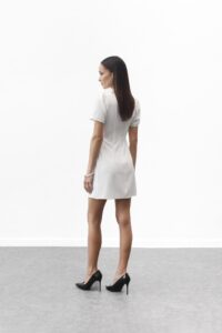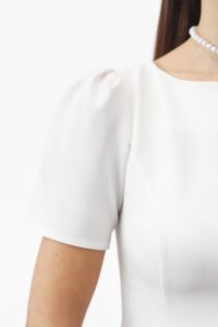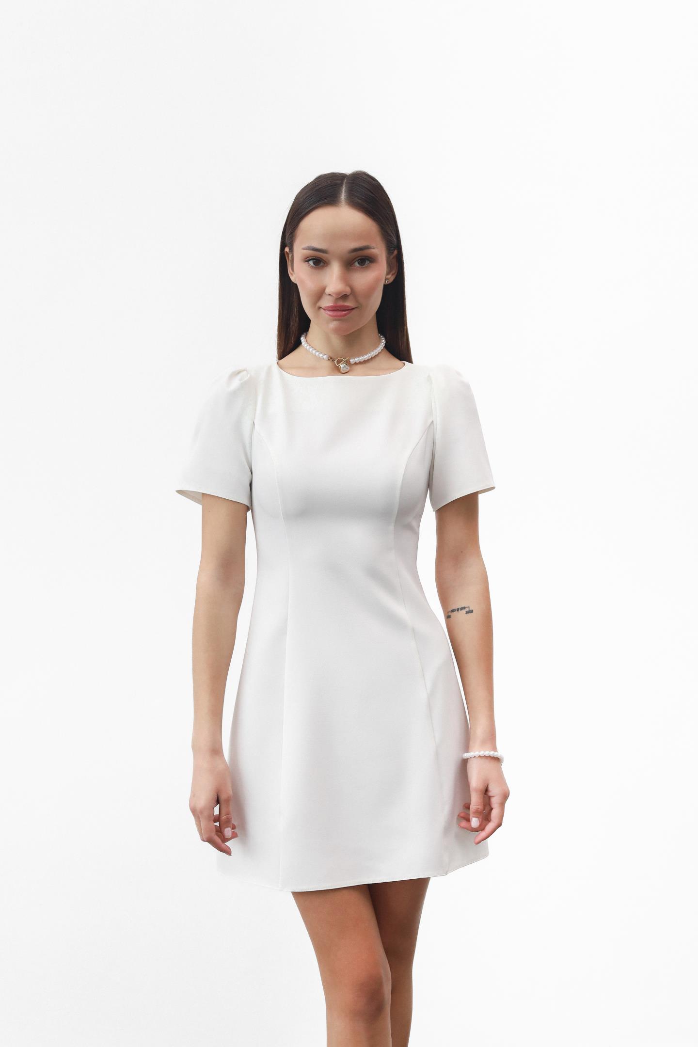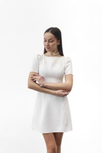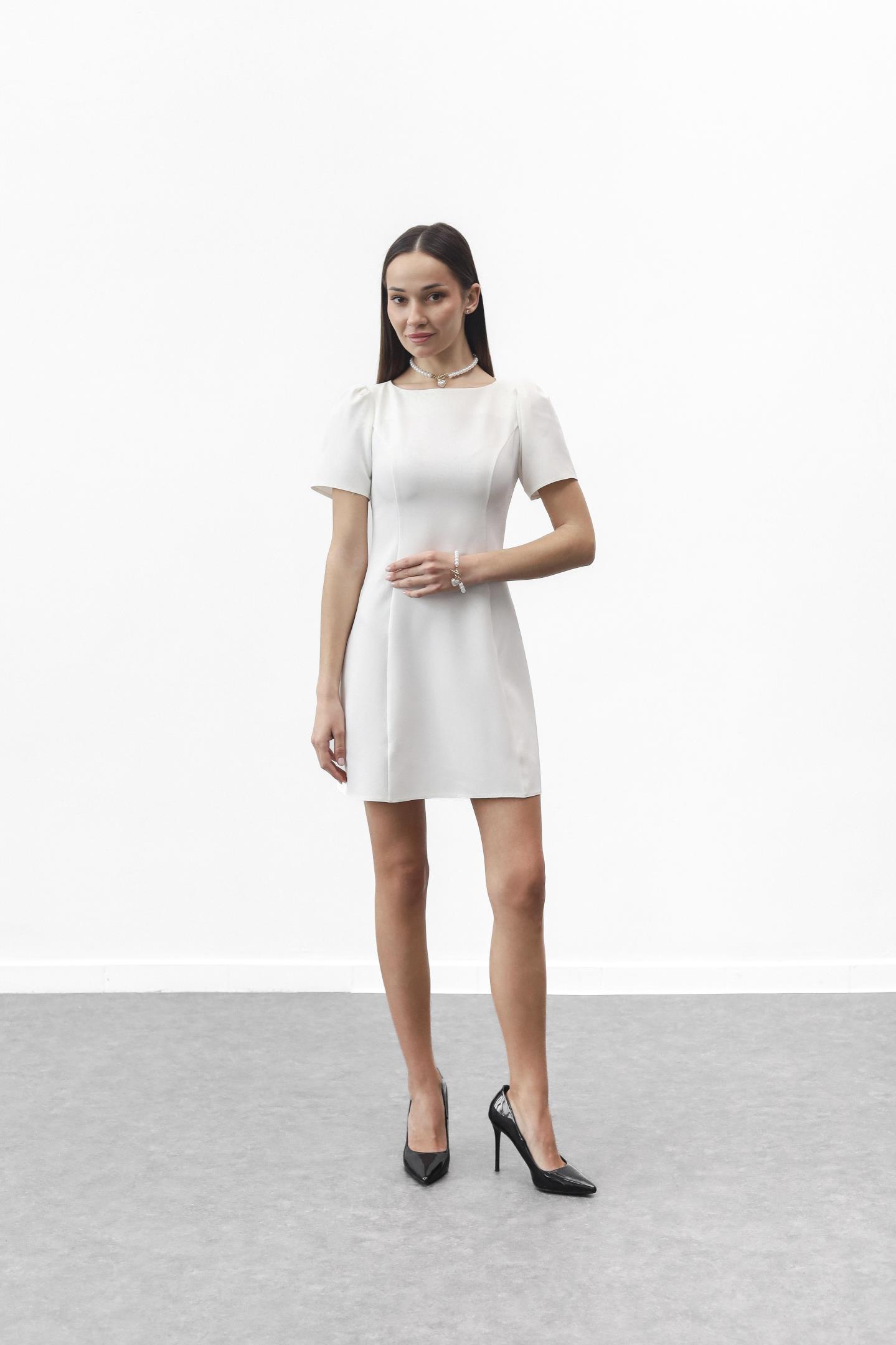 Сукня-міні — символ стилю та впевненості. Елегантний прямий або злегка приталений силует делікатно підкреслює фігуру. Короткі рукави-ліхтарики додають жіночності, круглий виріз зберігає лаконічність, а вертикальні шви формують витончений силует