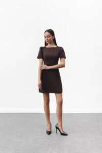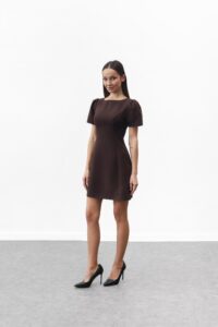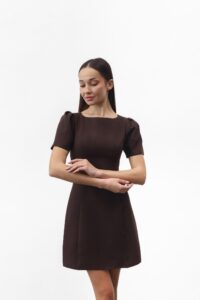 Сукня-міні — символ стилю та впевненості. Елегантний прямий або злегка приталений силует делікатно підкреслює фігуру. Короткі рукави-ліхтарики додають жіночності, круглий виріз зберігає лаконічність, а вертикальні шви формують витончений силует