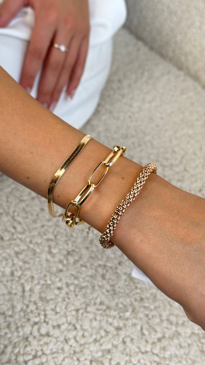 Набір із трьох стильних браслетів: класичний плетений джгут із виразною текстурою, гладка пласка «змійка», що елегантно облягає зап’ястя, та масивний ланцюг із великими геометричними ланками для сучасного вигляду. Браслети можна носити окремо або поєднувати, створюючи ефектний багатошаровий образ