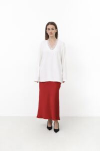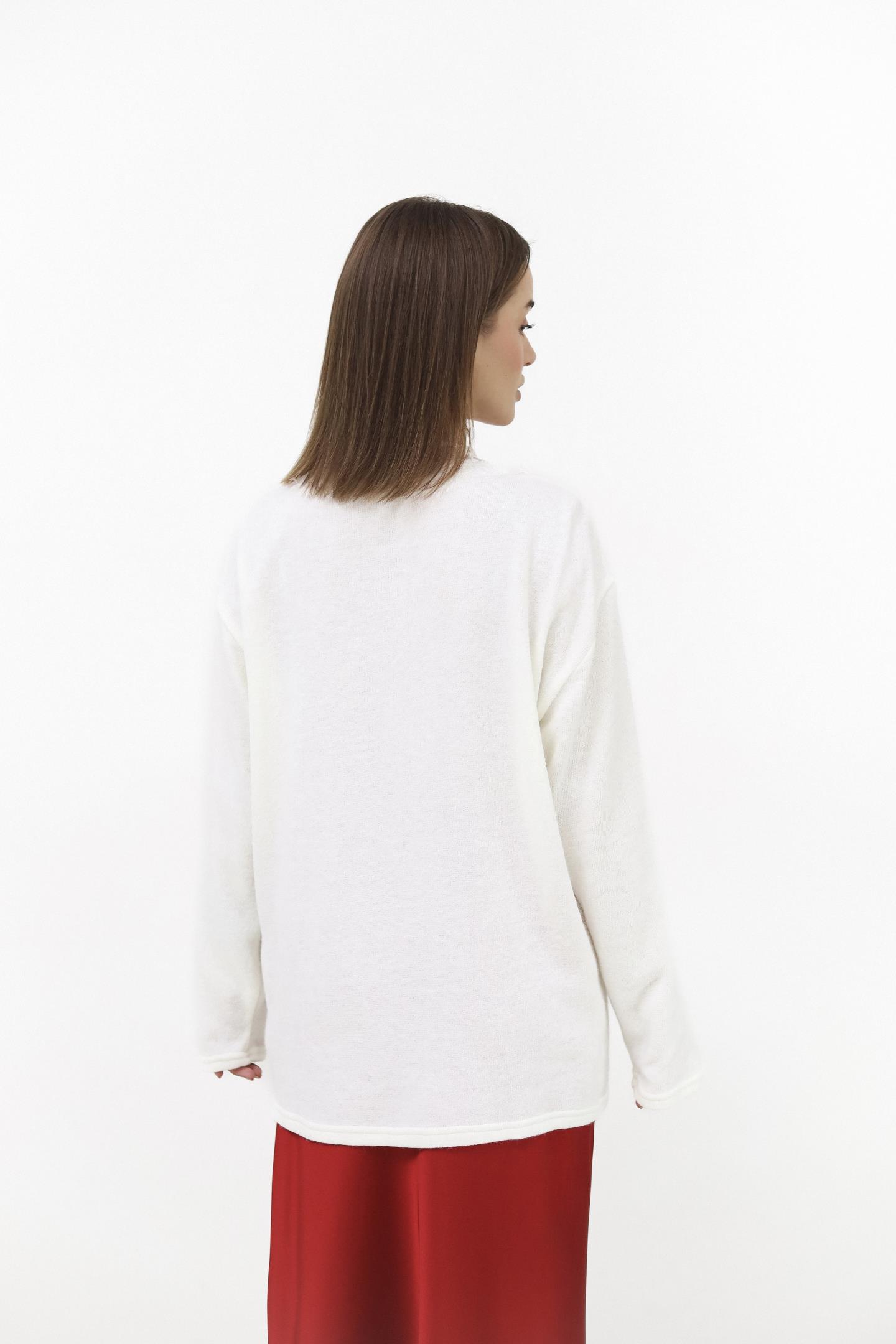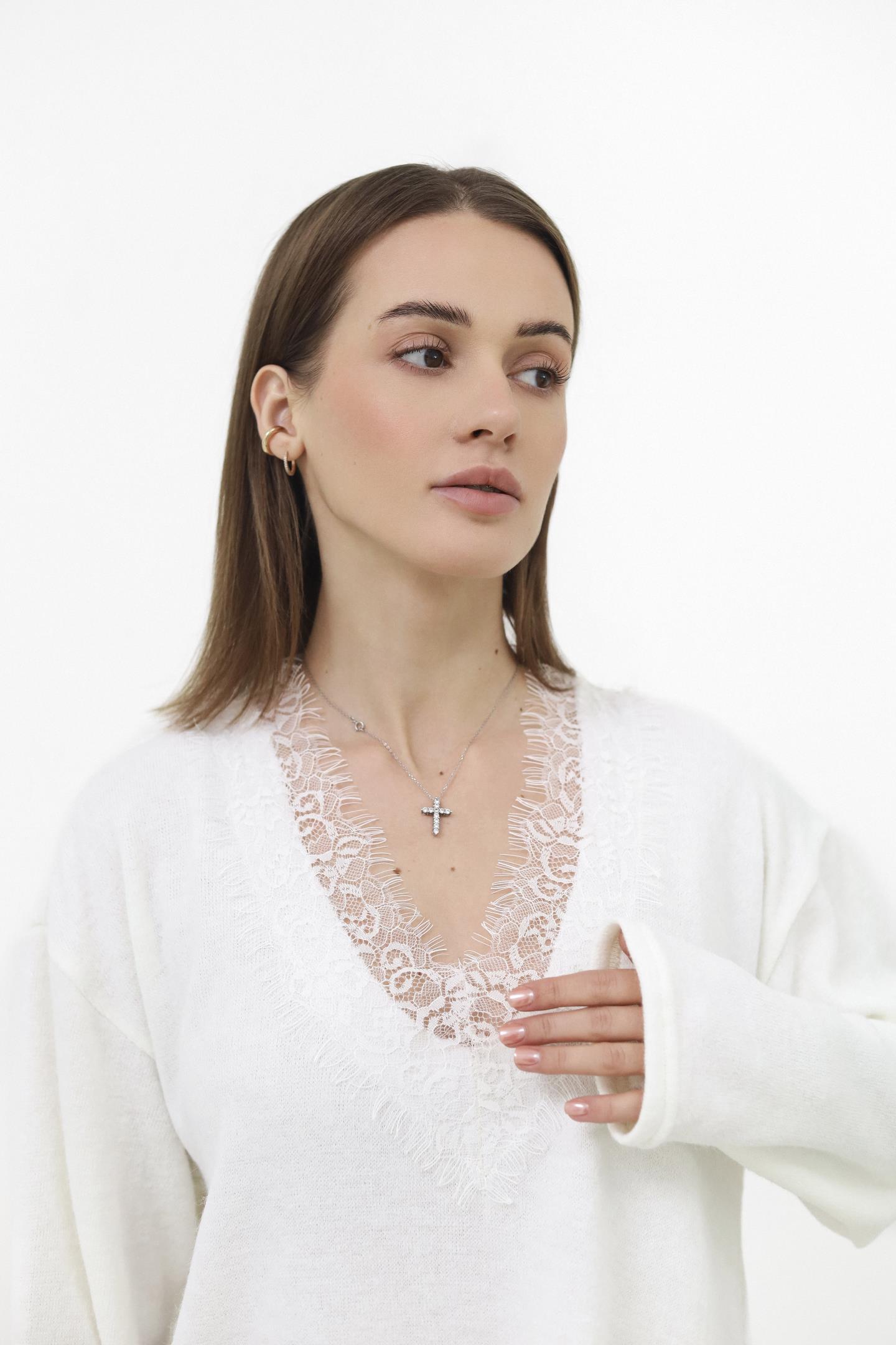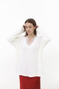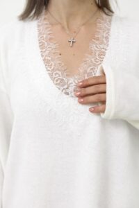 Светр, який створений для затишних моментів. Декольте з мереживом додає ніжного акценту, роблячи образ одночасно теплим і жіночним. Легкий силует м’яко підкреслює фігуру та ідеально гармонує з джинсами чи спідницями.