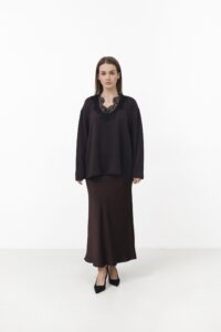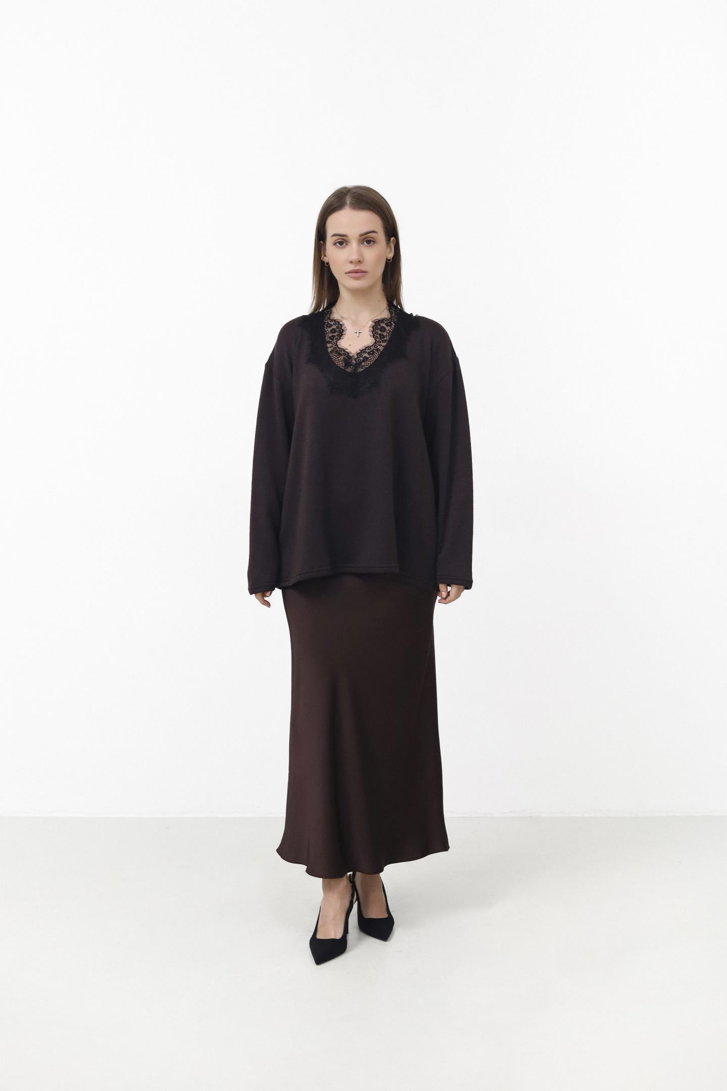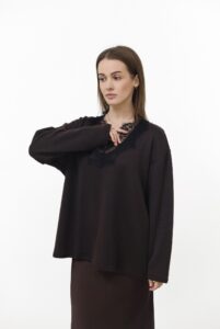 Светр, який створений для затишних моментів. Декольте з мереживом додає ніжного акценту, роблячи образ одночасно теплим і жіночним. Легкий силует м’яко підкреслює фігуру та ідеально гармонує з джинсами чи спідницями.