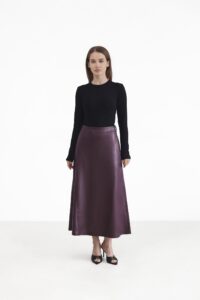 Міді-спідниця А-силуету з екошкіри з легким глянцем поєднує сучасність і розкіш. М’яка екошкіра ніжно обіймає талію, а розкльошений крій додає легкості та жіночності. Універсальний дизайн робить цю спідницю must-have для будь-якого гардеробу