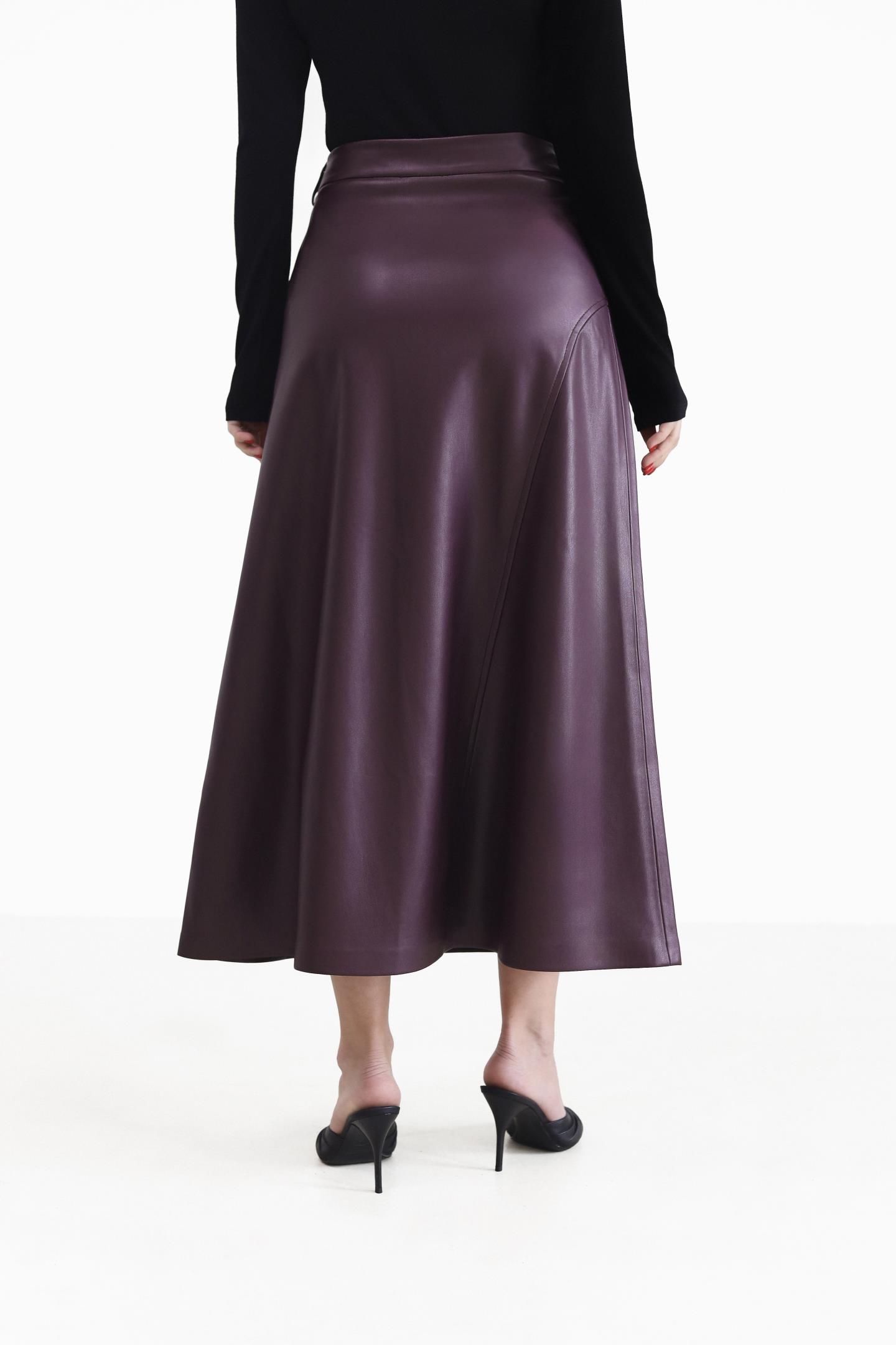 Шкіряна спідниця міді з розкльошеним кроєм Бордо