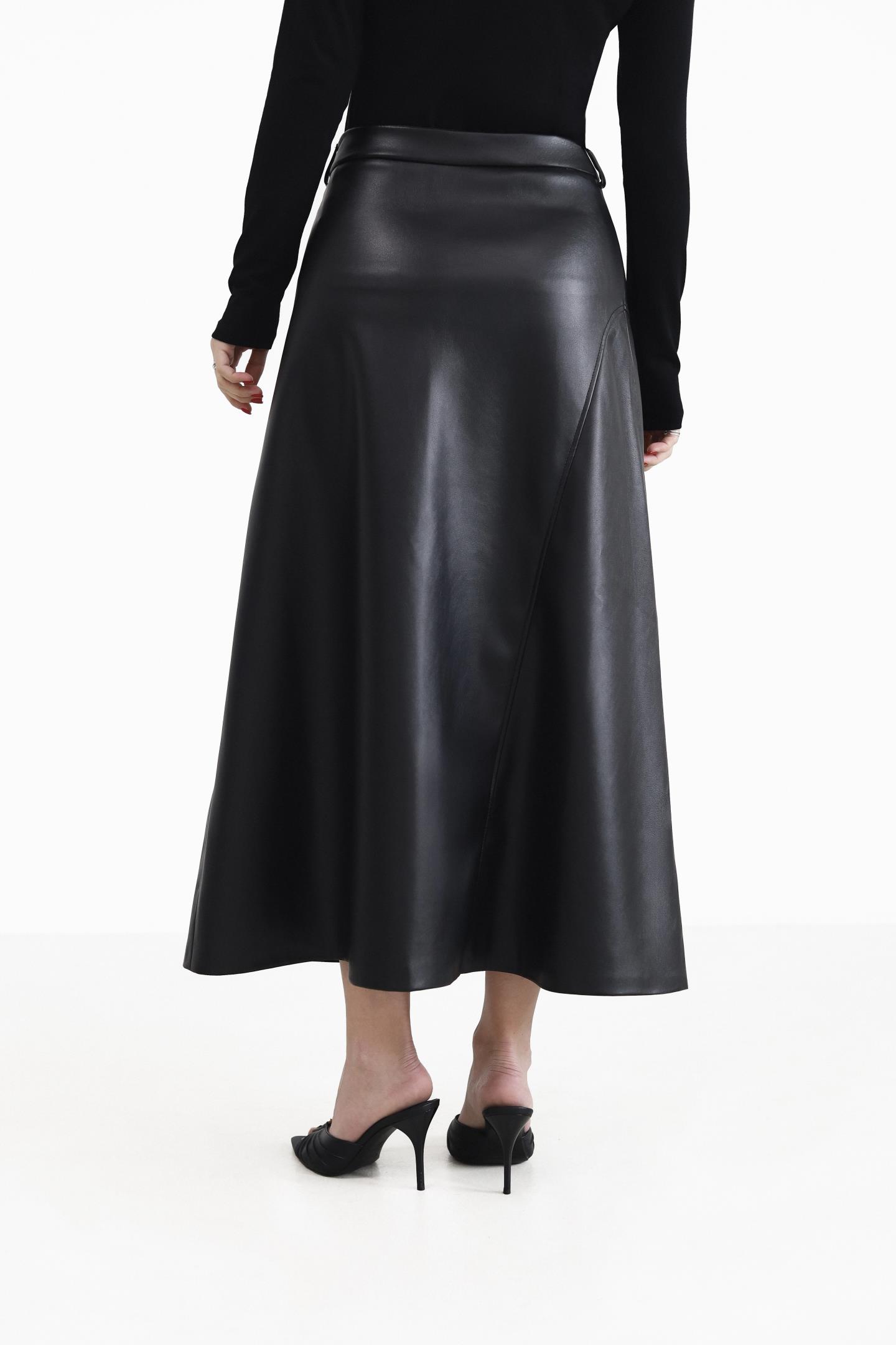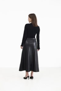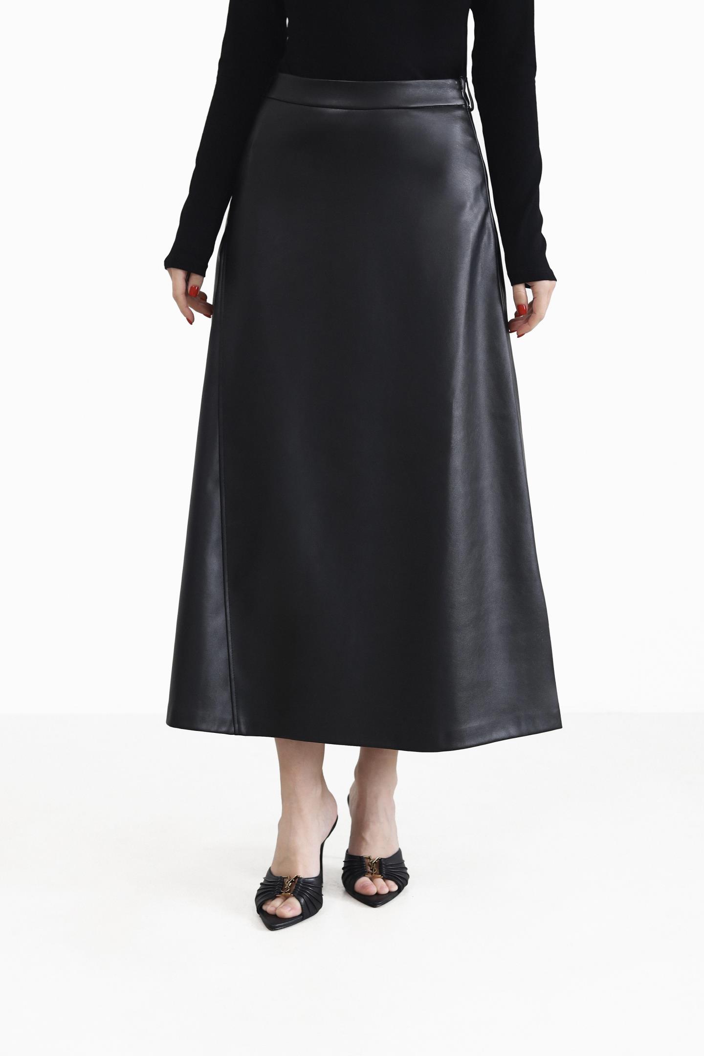 Міді-спідниця А-силуету з екошкіри з легким глянцем поєднує сучасність і розкіш. М’яка екошкіра ніжно обіймає талію, а розкльошений крій додає легкості та жіночності. Універсальний дизайн робить цю спідницю must-have для будь-якого гардеробу