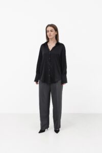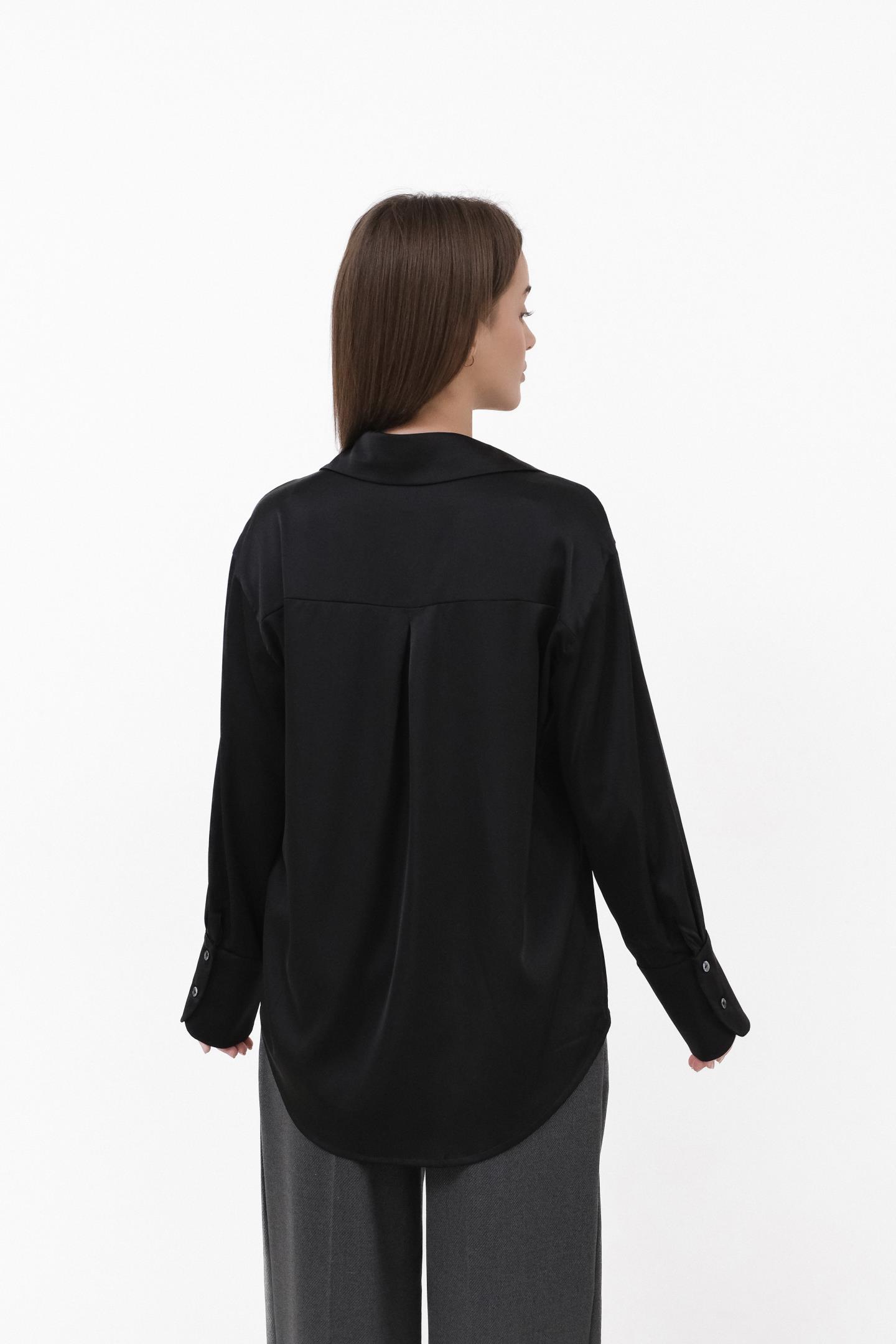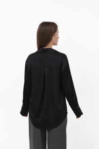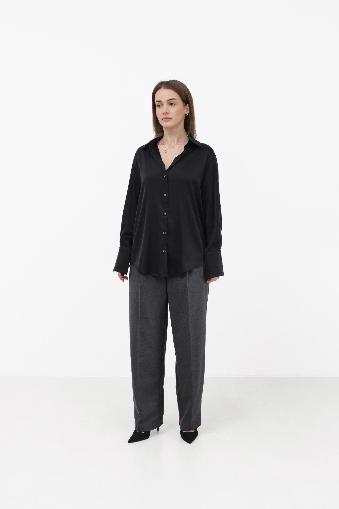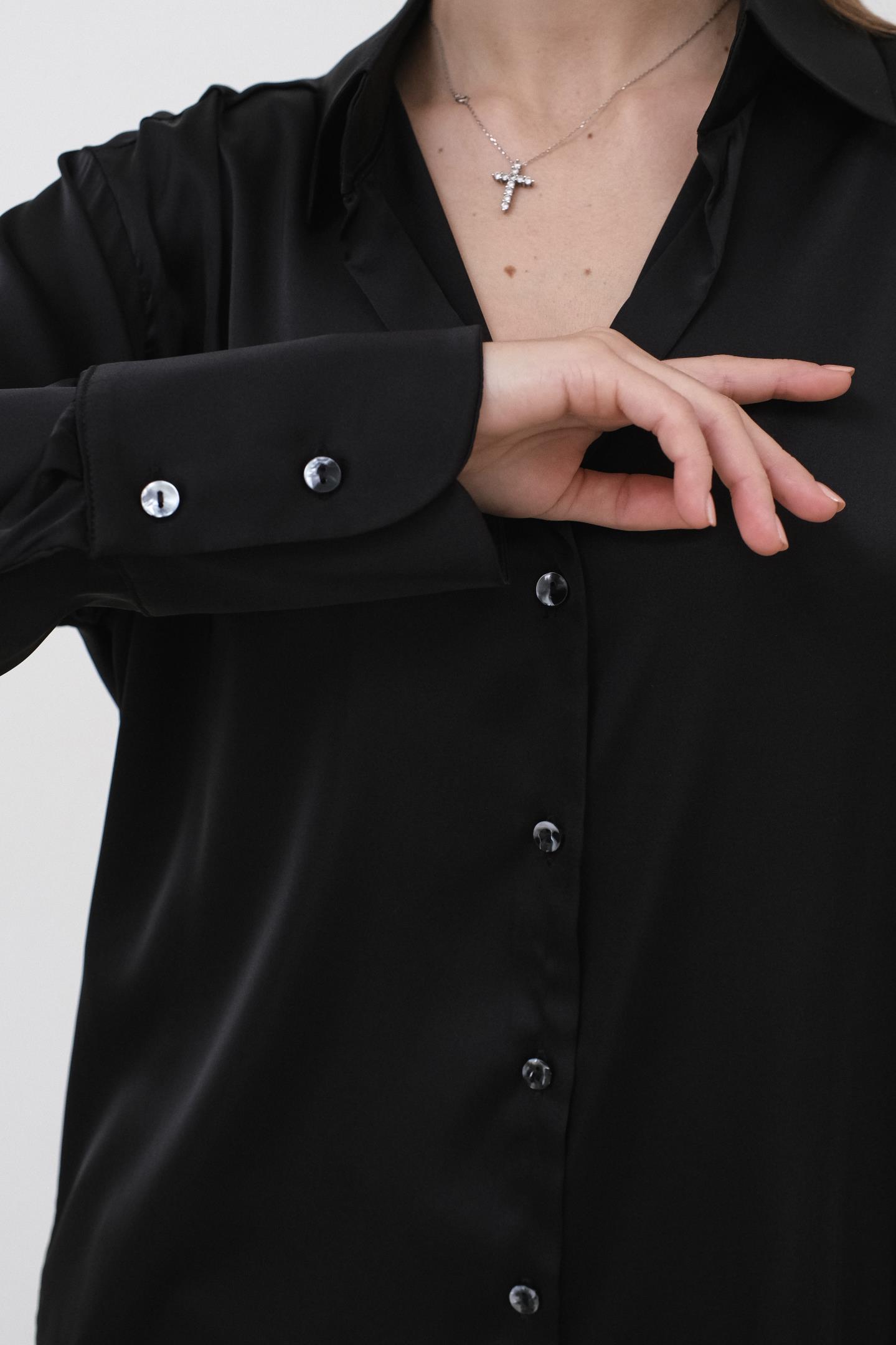 Атласна жіноча блуза з шовку поєднує розкіш, ніжність і бездоганну легкість. Класичний комір, акуратні манжети та продумані шви підкреслюють високу якість виробу, а трохи вільний крій забезпечує універсальність — блуза доречна як у самостійних образах, так і в поєднанні з жакетом або светром.