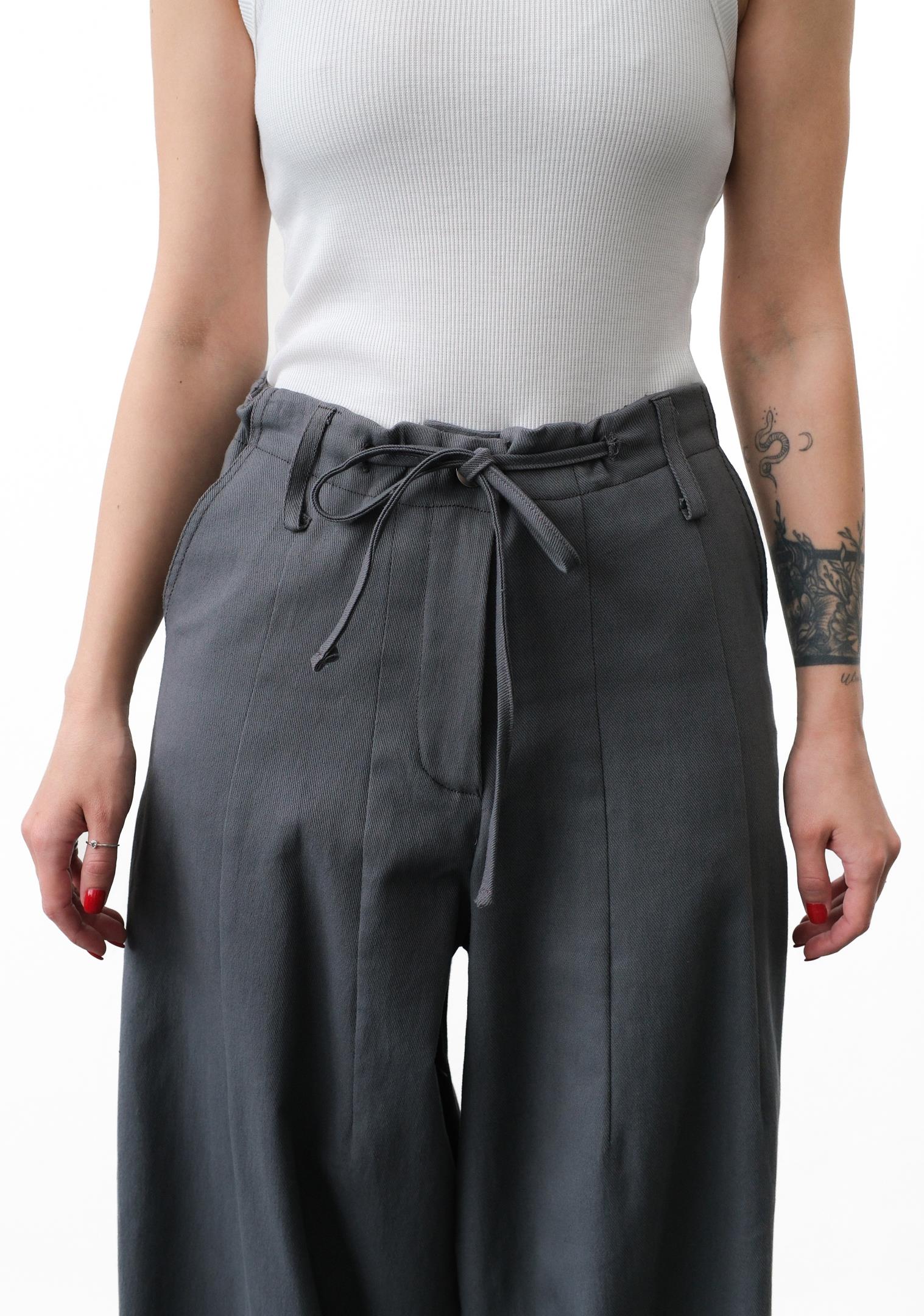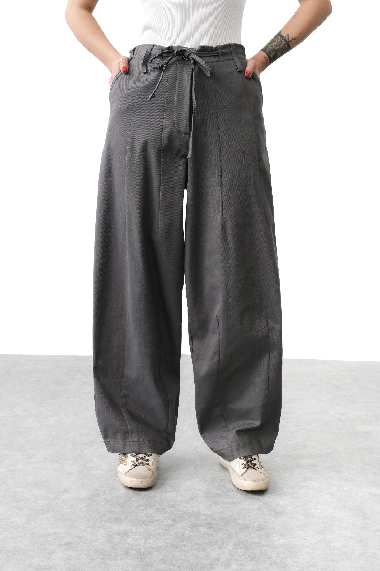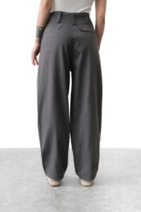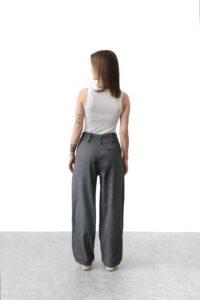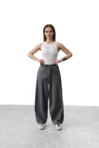 Жіночі штани вільного прямого крою з оверсайз-силуетом. Висока талія формує акуратний силует, а складки спереду додають образу витонченості. Пояс із зав’язками м’яко фіксує модель та створює відчуття легкості, дозволяючи формувати стильні класичні й кежуал-образи з сорочками, светрами чи жакетами.