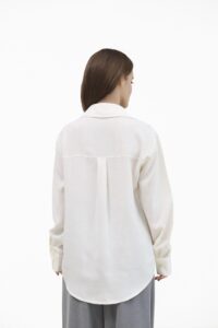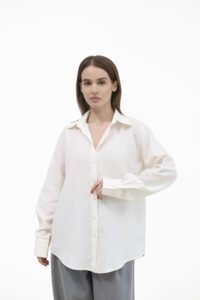 Легка біла сорочка вільного крою — універсальна база, що додає образу свіжості та акуратної елегантності. Комір-стійка, подовжена лінія плеча та застібка на ґудзики формують сучасний чистий силует, а м’яка дихаюча тканина приємна до тіла й комфортна на щодень
