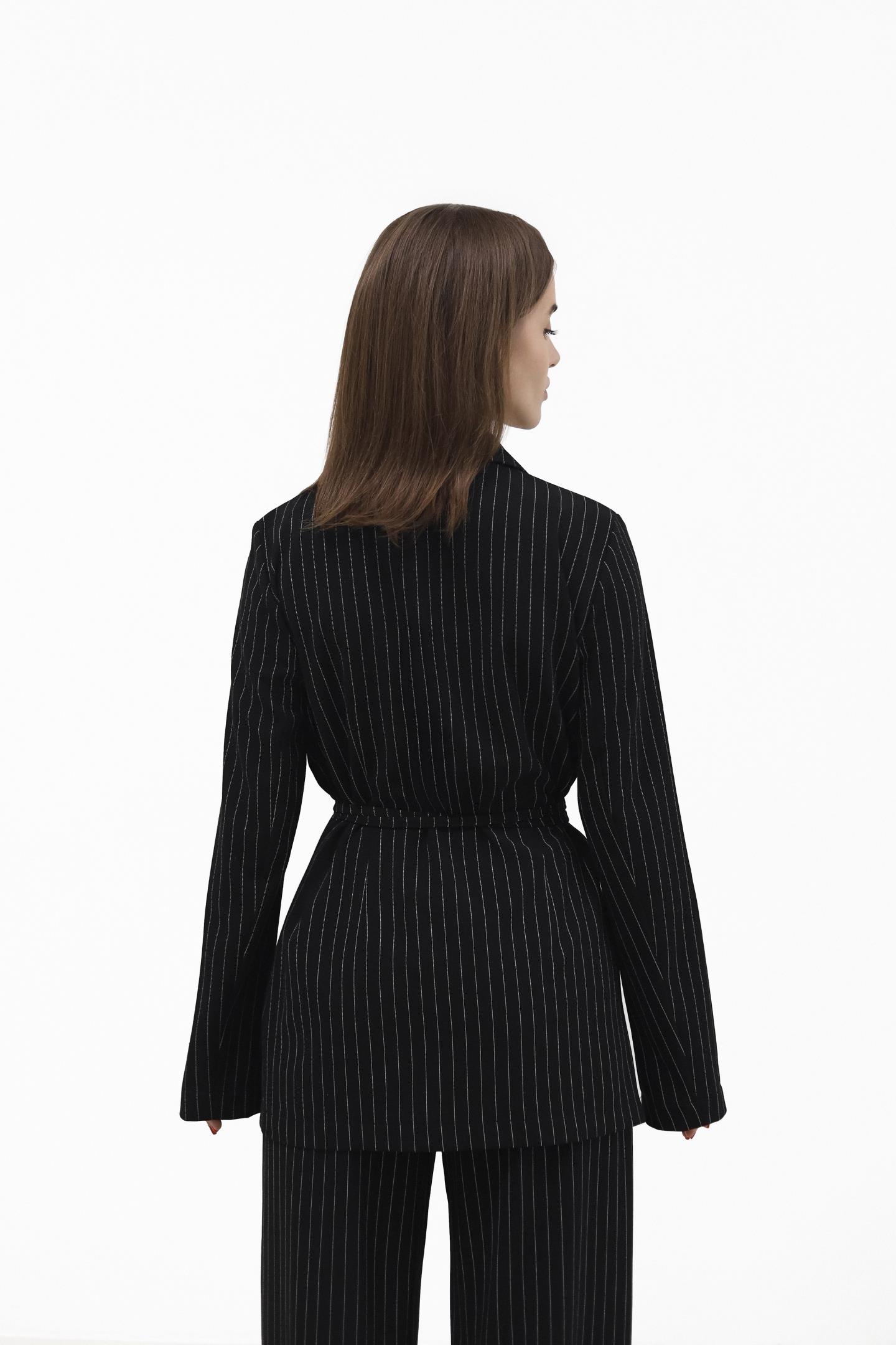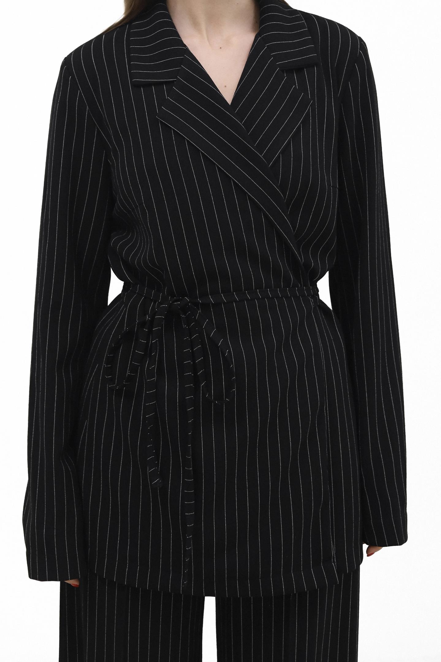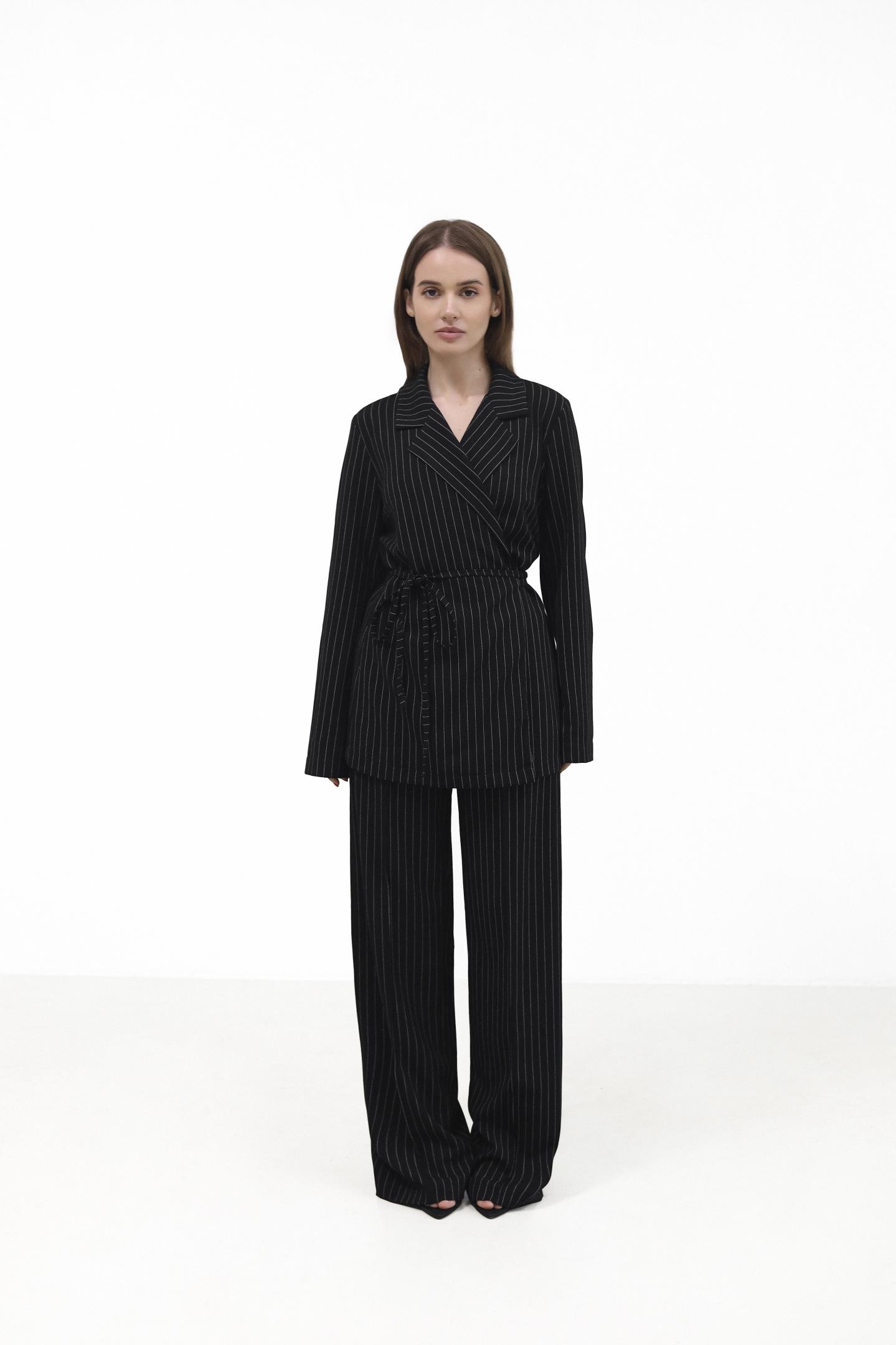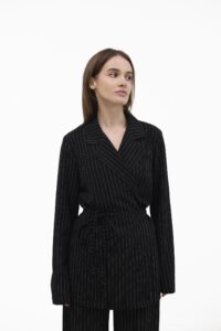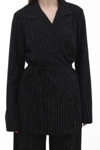 Сорочка-жакет у тонку смужку-ефектна база з характером. Приємна до тіла, красиво тримає форму та створена для сміливого носіння соло. Глибокий виріз, декоративні елементи й зав’язочки на талії підкреслюють силует і додають образу виразності. Легко комбінується та стилізується під будь-який настрій