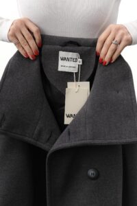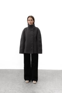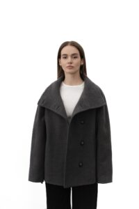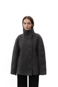 Трендове укорочене пальто — базова деталь сучасного гардероба з ноткою елегантності. М’яка змішана тканина з вовни, високий комір та довгі рукави з хлястиком на ґудзику створюють виразний силует, а застібка спереду і практичні бічні кишені поєднують стиль і комфорт