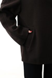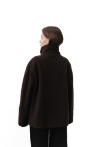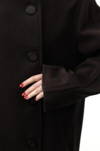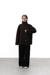 Трендове укорочене пальто — базова деталь сучасного гардероба з ноткою елегантності. М’яка змішана тканина з вовни, високий комір та довгі рукави з хлястиком на ґудзику створюють виразний силует, а застібка спереду і практичні бічні кишені поєднують стиль і комфорт