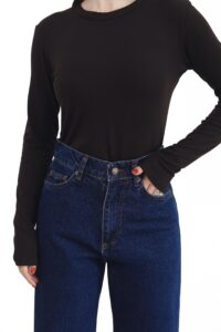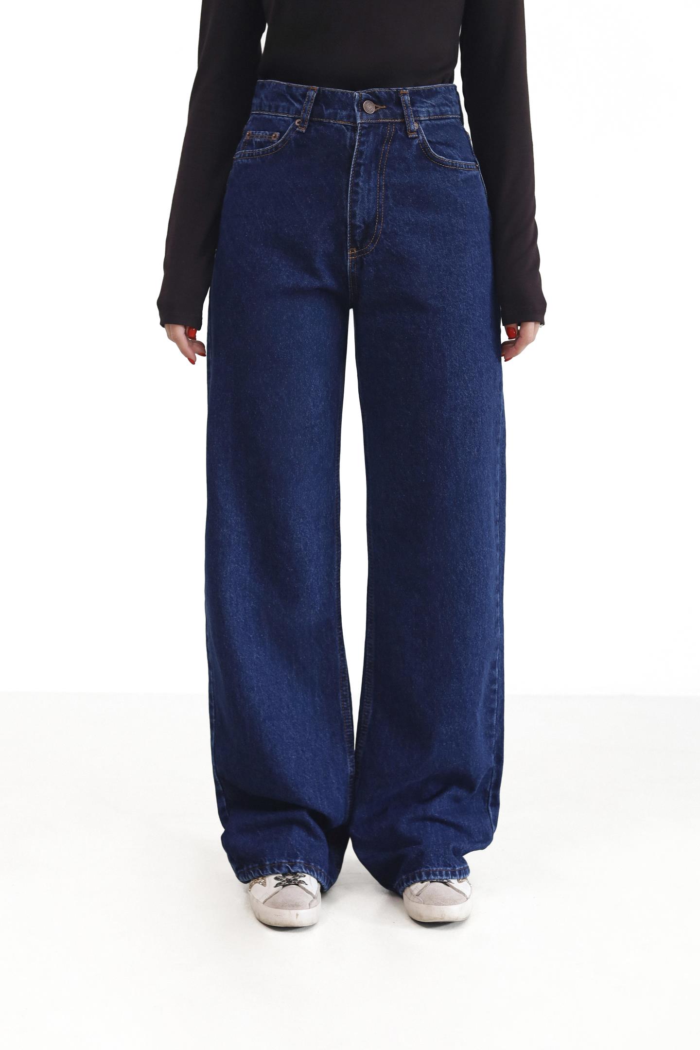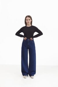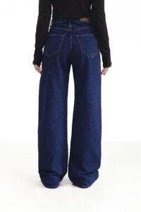 Жіночі джинси-палаццо з широкими штанинами з щільного синього деніму. Висока талія підкреслює фігуру, а вільний крій подовжує силует і додає легкості рухам. Класична застібка, кишені та мінімалістичний дизайн роблять модель універсальною — ідеально підходить для повсякденних, street-style образів