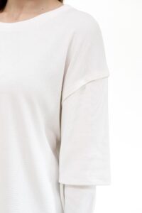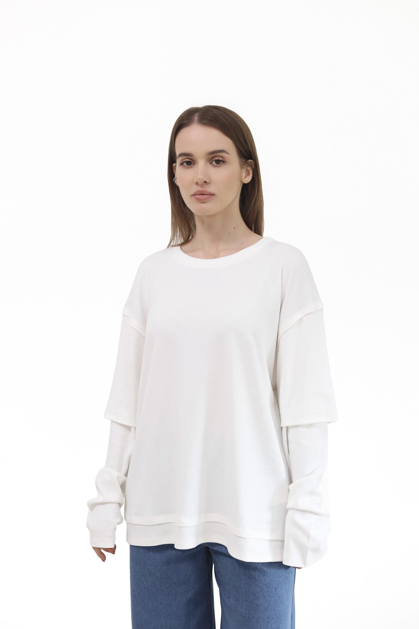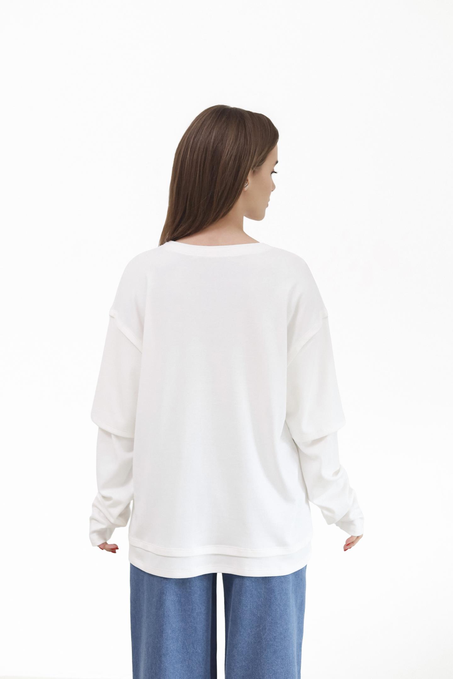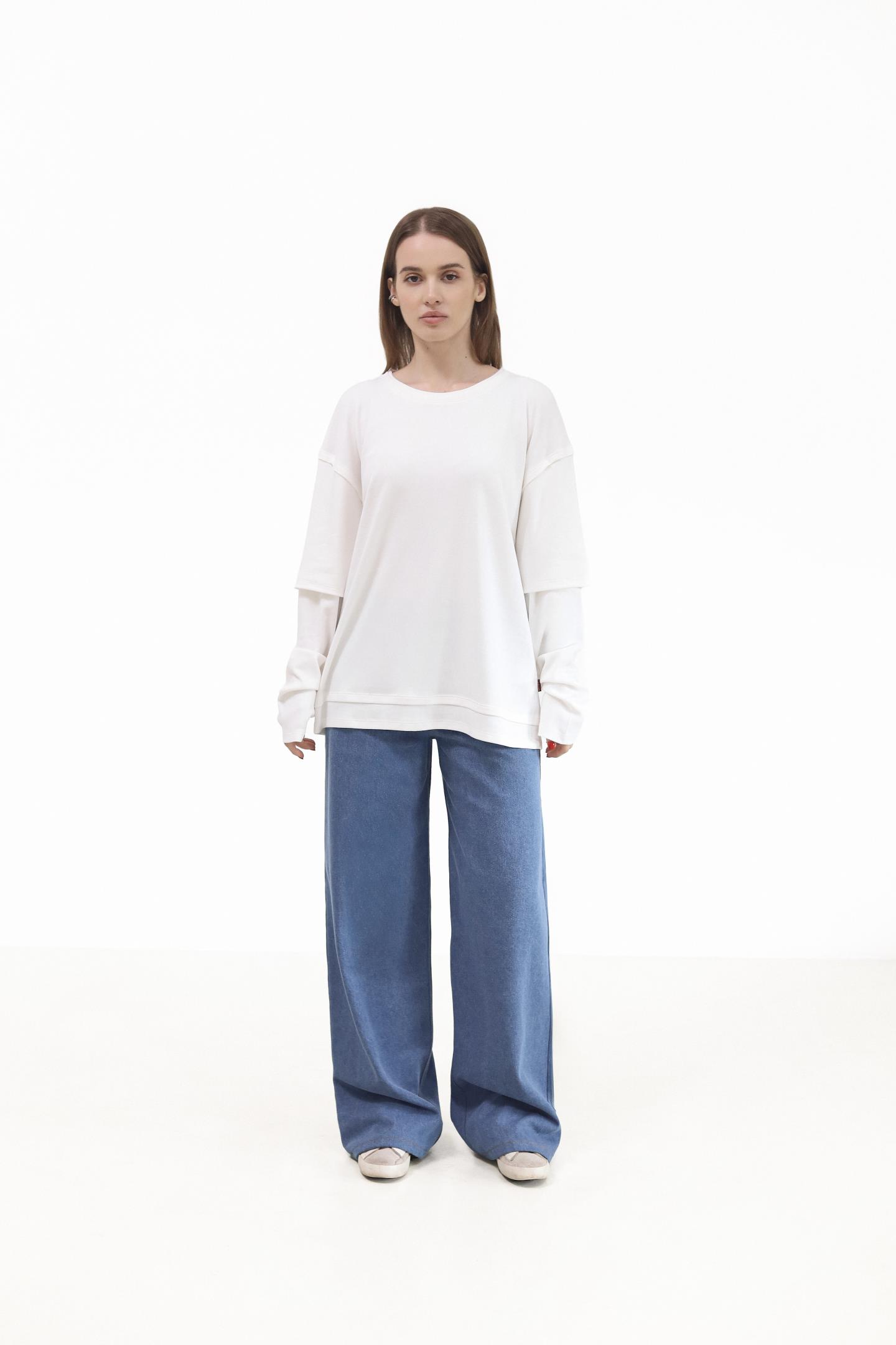 Oversize світшот із круглим вирізом та довгими рукавами, що створюють сучасний та невимушений образ. Головна особливість — подвійна нижня кромка та манжети, які створюють стильний багатошаровий ефект. Ідеально поєднується з джинсами, легінсами або спідницями для повсякденних і casual-образів