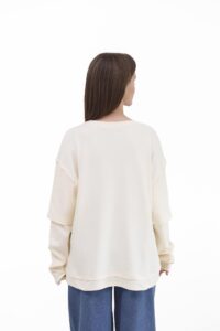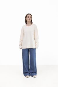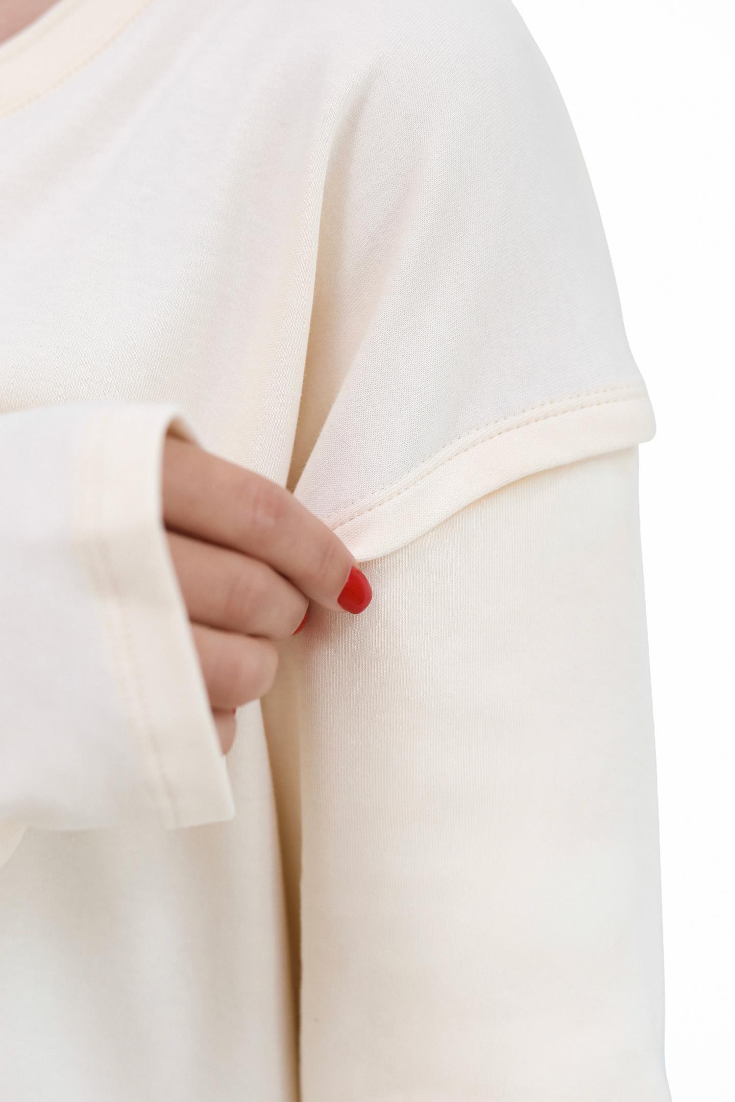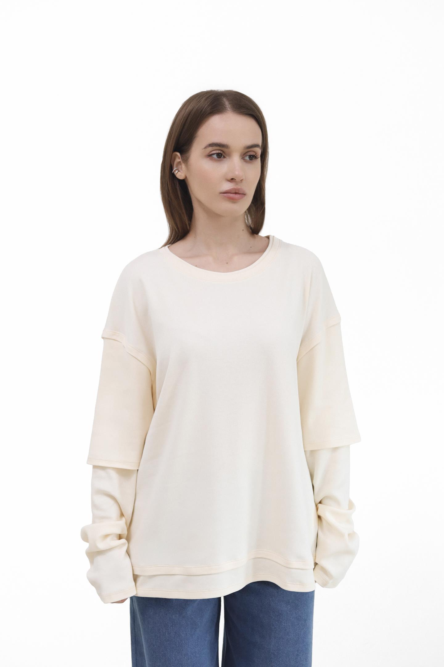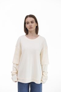 Oversize світшот із круглим вирізом та довгими рукавами, що створюють сучасний та невимушений образ. Головна особливість — подвійна нижня кромка та манжети, які створюють стильний багатошаровий ефект. Ідеально поєднується з джинсами, легінсами або спідницями для повсякденних і casual-образів