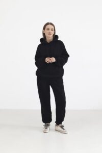 М’який жіночий костюм із бавовни поєднує затишок і сучасний дизайн. Худі з капюшоном та джогери з еластичним поясом і низом формують стильний силует, та прорізні кишені додають функціональності. Легка тканина дарує свободу рухів у будь-який день.