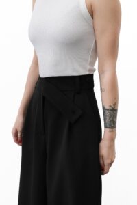 Однотонні штани-палаццо — стильне поєднання елегантності та сучасного силуету. Модель із защипами спереду, стрілками по всій довжині та практичними боковими кишенями. Застібаються на блискавку та гудзик. Трендовий крій надає образу легкості та витонченості.