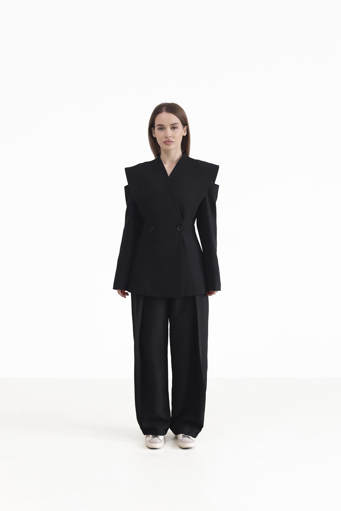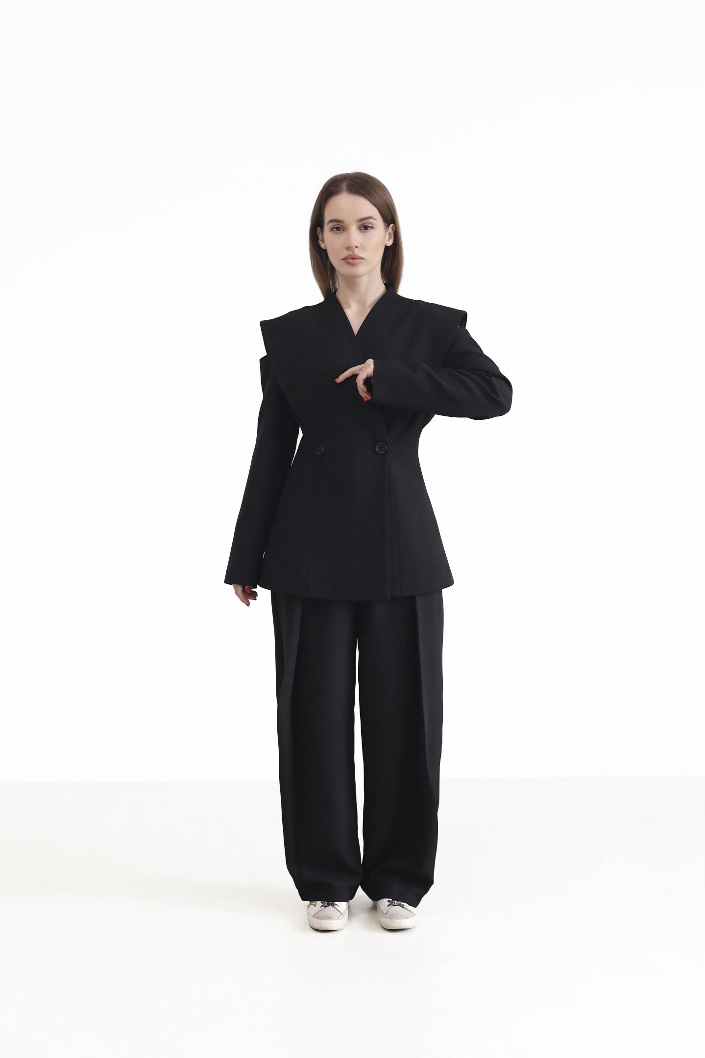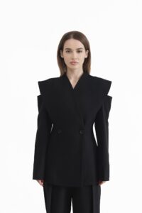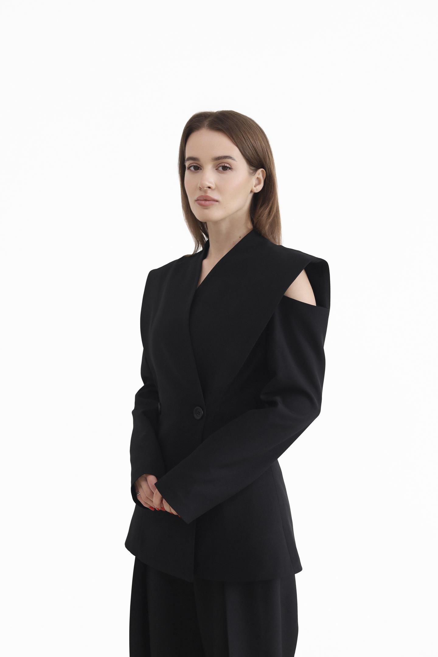Елегантний двобортний піджак — вишукана модель, що підкреслює жіночність і стиль. Піджак застібається на ґудзики, додаючи класичності та завершеності. Дизайнерський акцент у зоні плечей із делікатним вирізом створює відчуття відкритих плечей і надає образу особливого шарму
