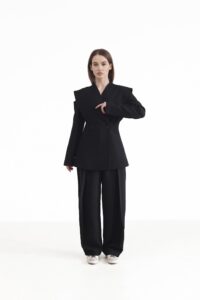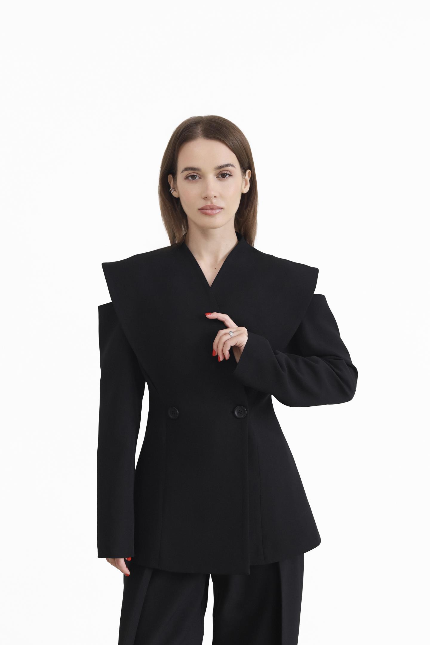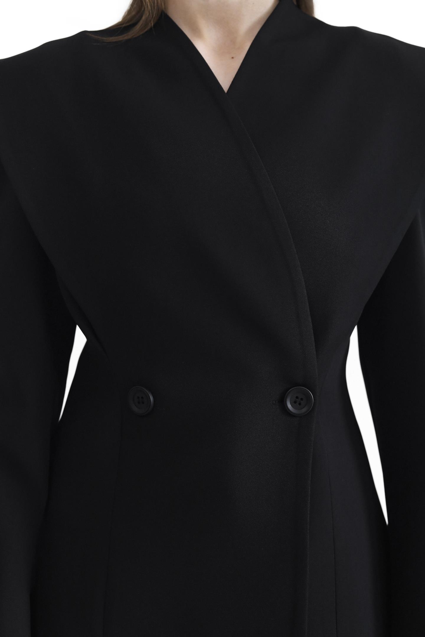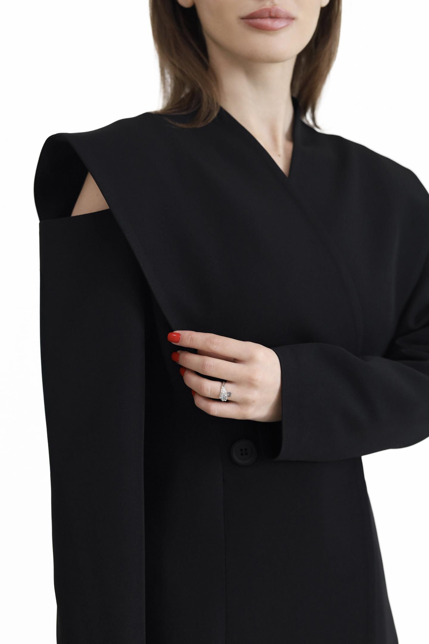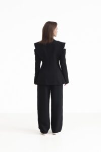 Елегантний двобортний піджак — вишукана модель, що підкреслює жіночність і стиль. Піджак застібається на ґудзики, додаючи класичності та завершеності. Дизайнерський акцент у зоні плечей із делікатним вирізом створює відчуття відкритих плечей і надає образу особливого шарму