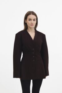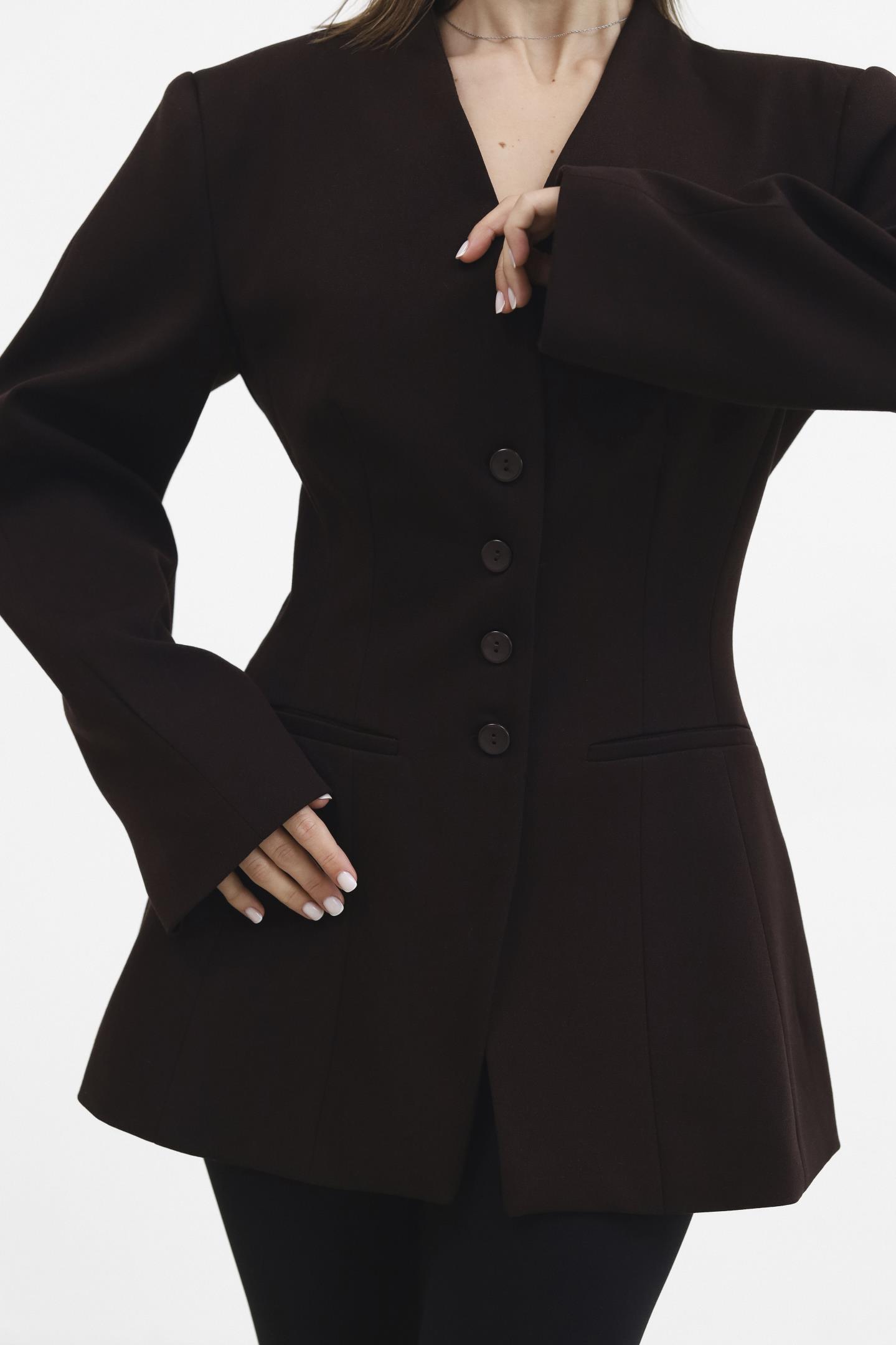 Подовжений піджак з виразною талією та V-вирізом створює охайний, витончений силует. Структурований крій і акуратні ґудзики додають образу стильної стриманості. Модель легко поєднується з класичними брюками, спідницями чи джинсами, підкреслюючи твою елегантність у будь-який день.