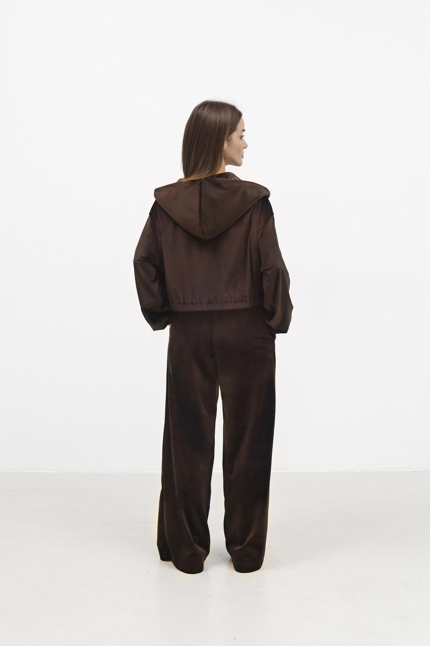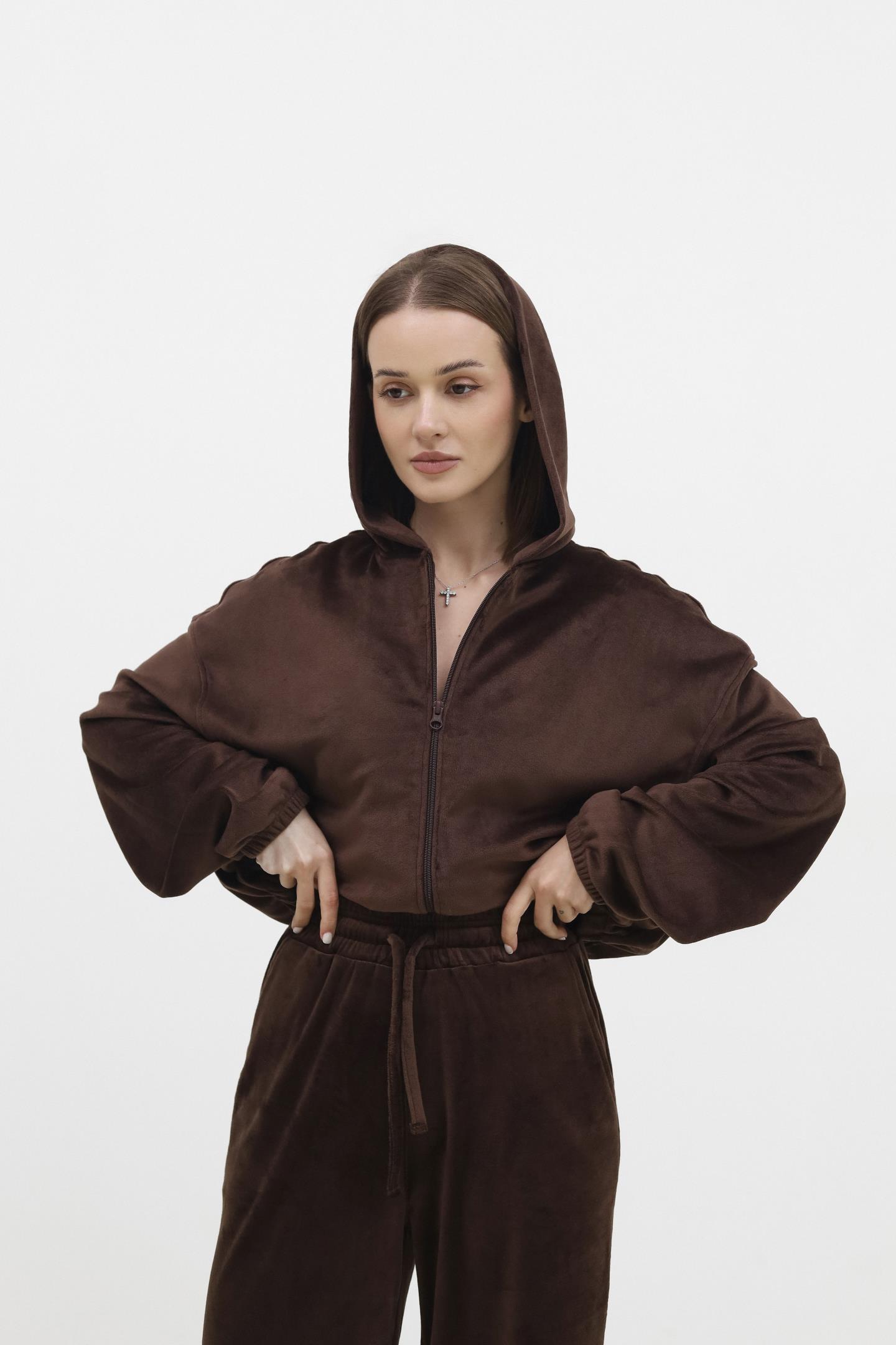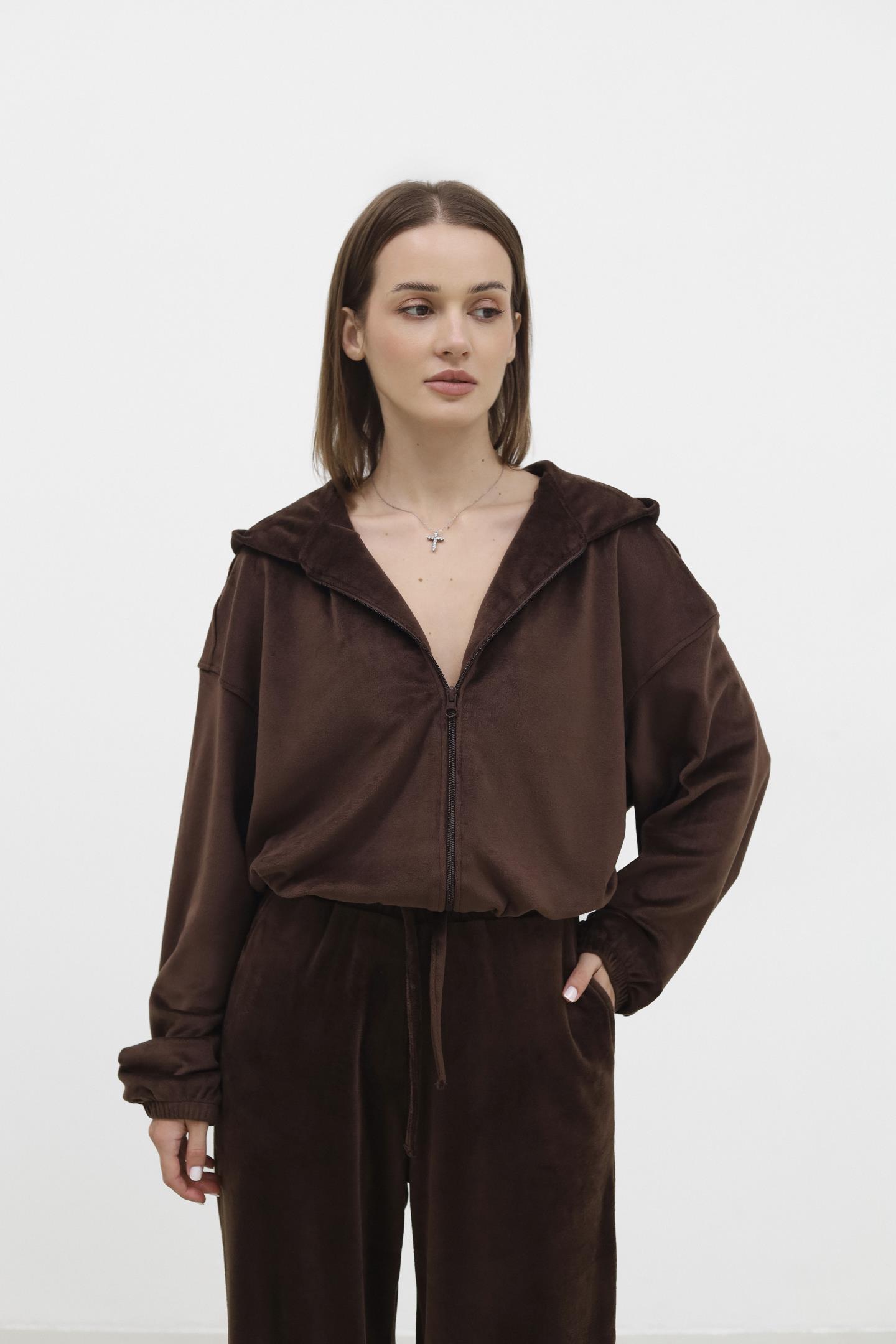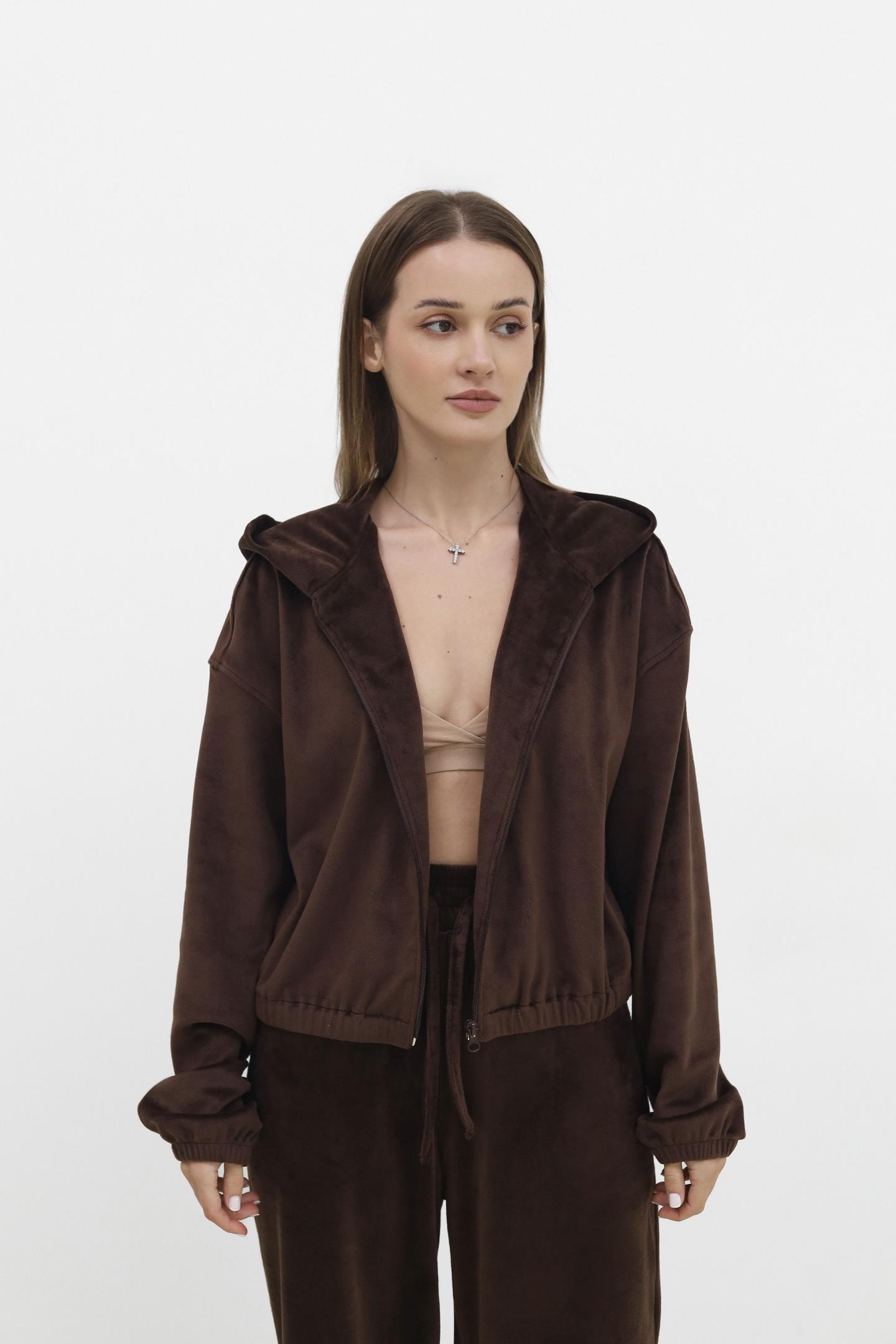 Головна Жінкам Кофти, боді и гольфи Жіноча велюрова кофта на блискавці Шоколад
