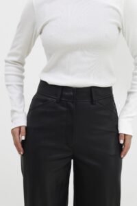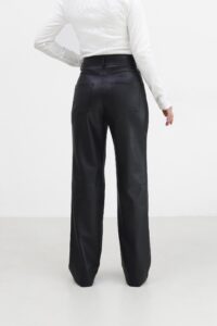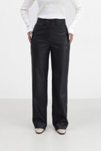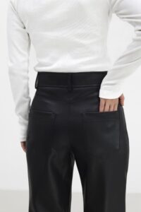 Шкіряні штани зі зручною посадкою та стильним акцентом на коліні. Модель м’яко лягає по фігурі, підкреслюючи силует, а декоративний шов на коліні додає образу виразності та трендовості. Завдяки продуманому крою штани виглядають акуратно й поєднуються з будь-яким верхом.