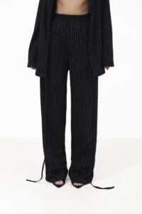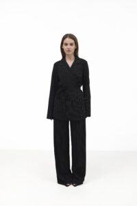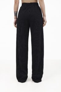 Широкі елегантні штани палаццо з тонкою білою смужкою — стильна база, що підкреслює фігуру. Високий пояс на еластичній резинці забезпечує зручну посадку, а м’які защипи спереду додають легкості та свободи рухів. Вертикальна смужка й вільний крій — ідеальне поєднання для подовженого силуету.