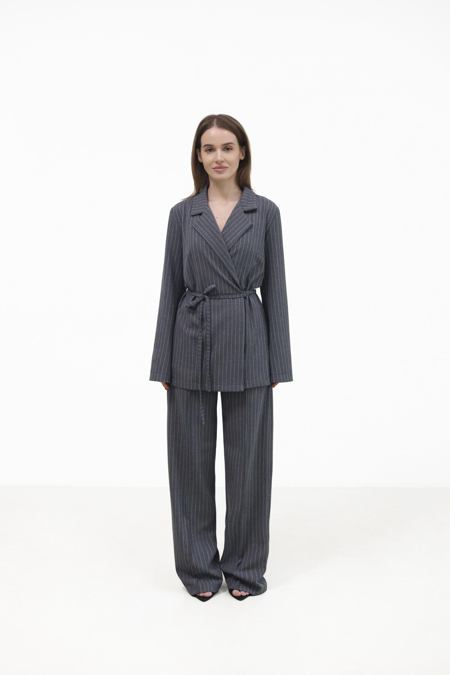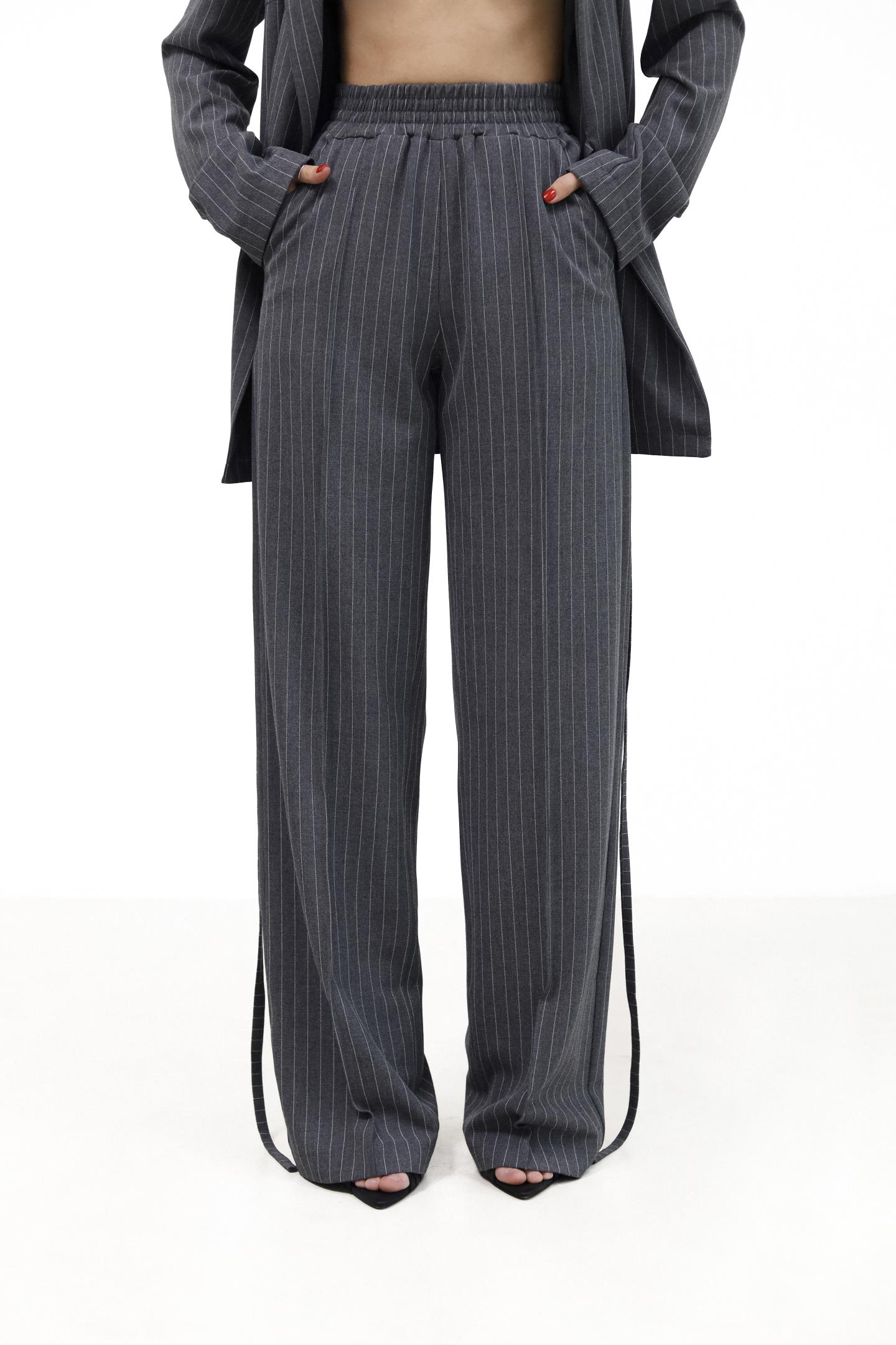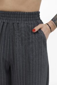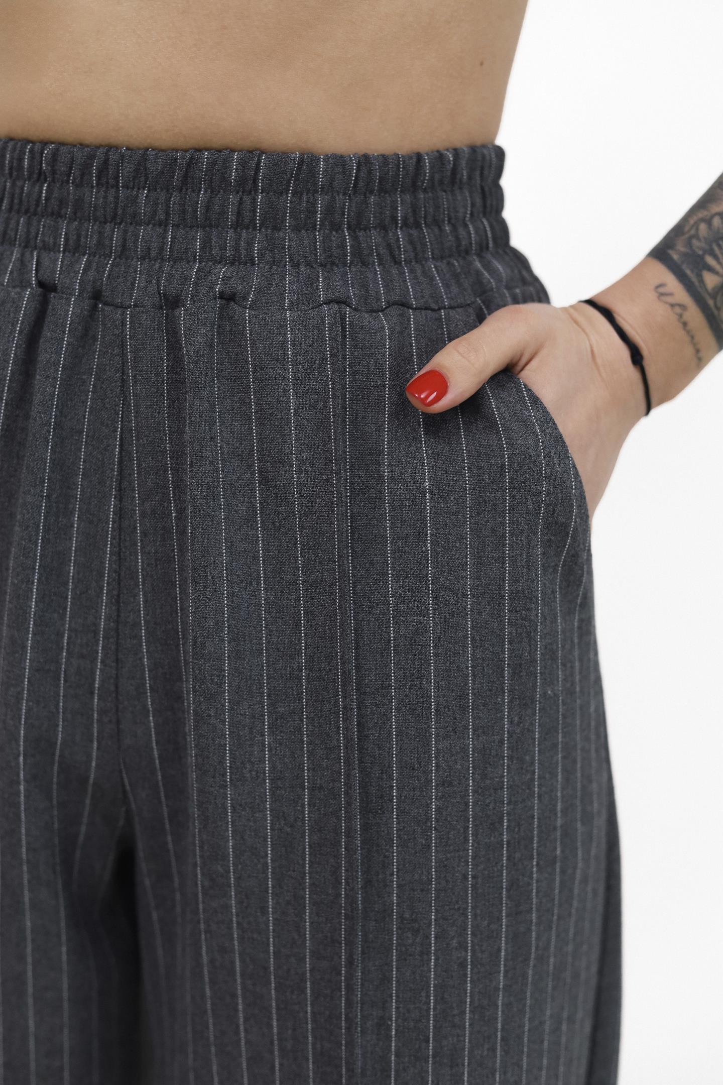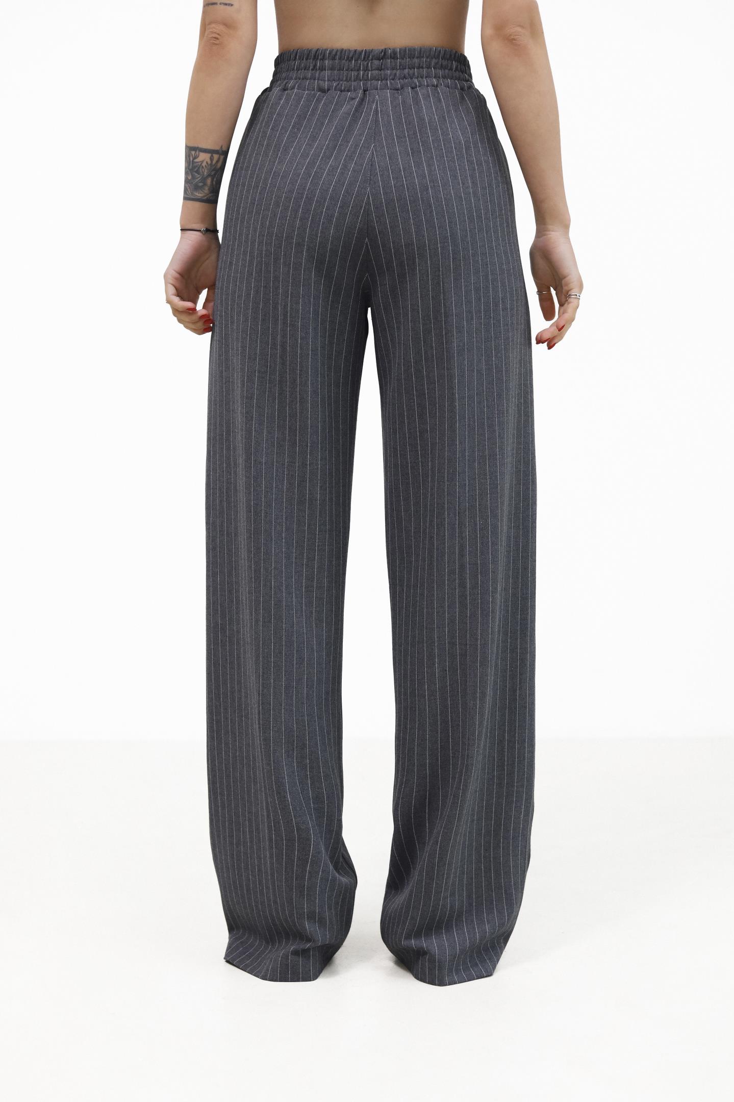 Широкі елегантні штани палаццо з тонкою білою смужкою — стильна база, що підкреслює фігуру. Високий пояс на еластичній резинці забезпечує зручну посадку, а м’які защипи спереду додають легкості та свободи рухів. Вертикальна смужка й вільний крій — ідеальне поєднання для подовженого силуету.