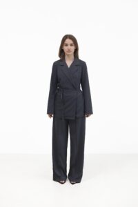 Широкі елегантні штани палаццо з тонкою білою смужкою — стильна база, що підкреслює фігуру. Високий пояс на еластичній резинці забезпечує зручну посадку, а м’які защипи спереду додають легкості та свободи рухів. Вертикальна смужка й вільний крій — ідеальне поєднання для подовженого силуету.