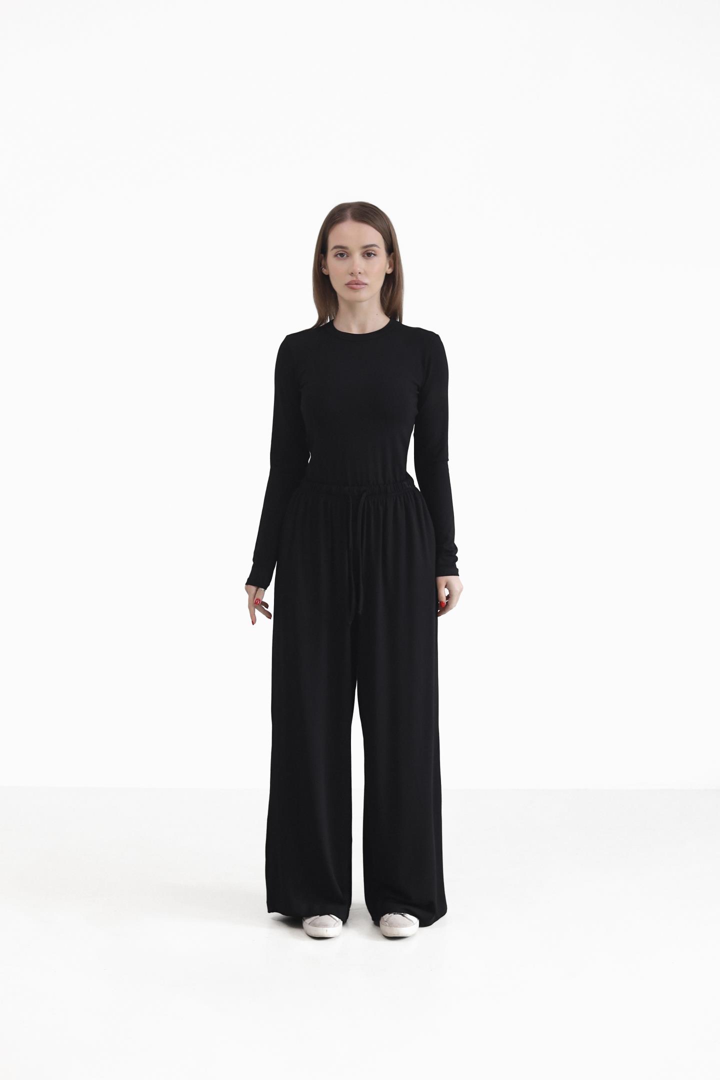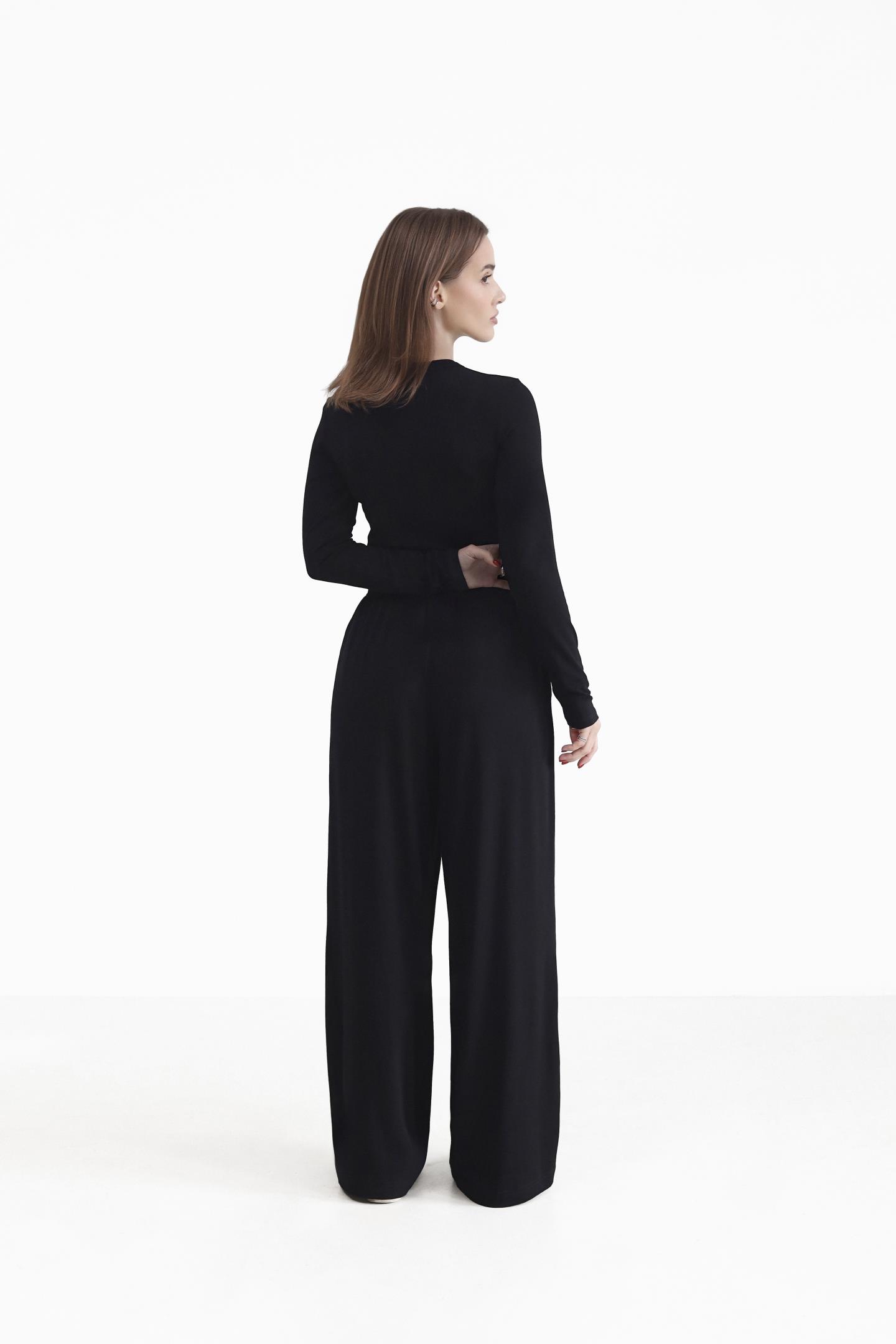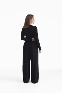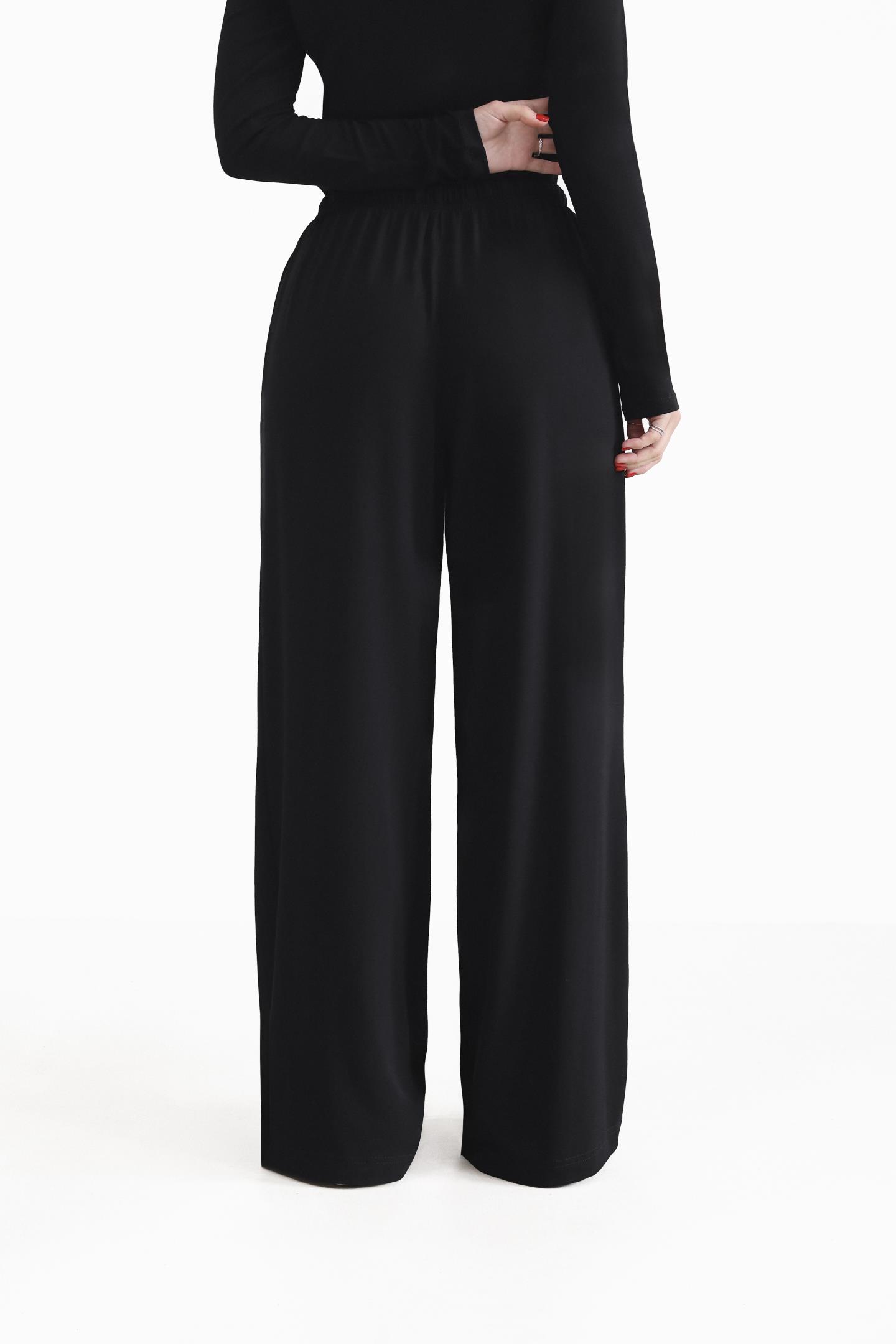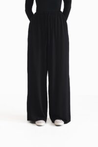 Стильні штани-палаццо для сучасного образу. Широкі штанини красиво спадають донизу, забезпечуючи свободу рухів. Приємна на дотик тканина добре тримає форму. Еластичний пояс із зав’язкою гарантує зручну посадку, а бічні кишені додають практичності. Ідеальний варіант для щоденних образів