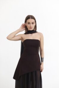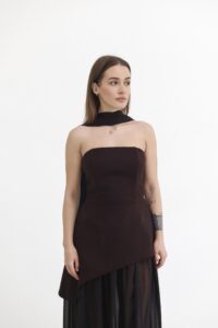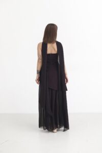 Жіноче плаття-трійка — вишуканий комплект, що складається з сукні, легкої спідниці та шарфа, який додає образу завершеності. Асиметричний крій підкреслює фігуру, а легкий фатин додає руху й повітряності. Шарф завершує образ і дозволяє варіювати стилізацію. Ідеальний вибір для особливих моментів.