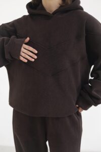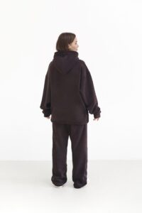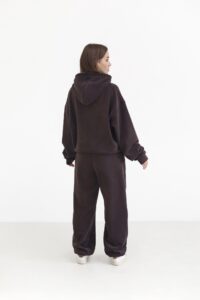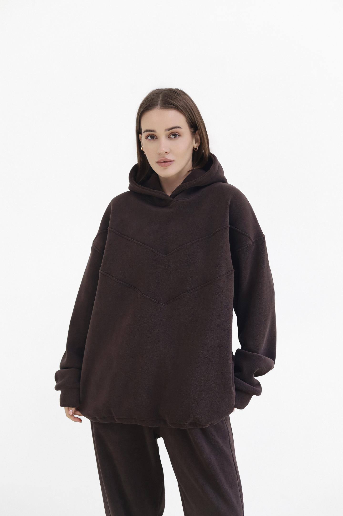Жіночий костюм з флісу — теплий, м’який і неймовірно комфортний. Двостороння флісова тканина огортає затишком, а вільна оверсайз-посадка з капюшоном надійно захищає у прохолодну погоду. Універсальний комплект для щоденних прогулянок і стильних casual-луків.