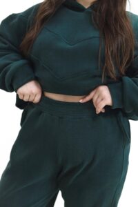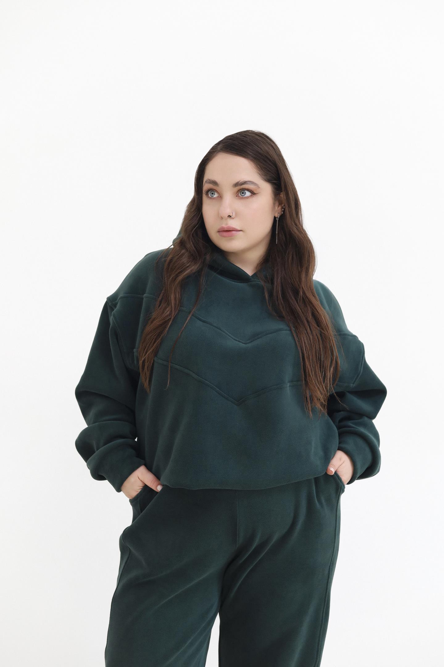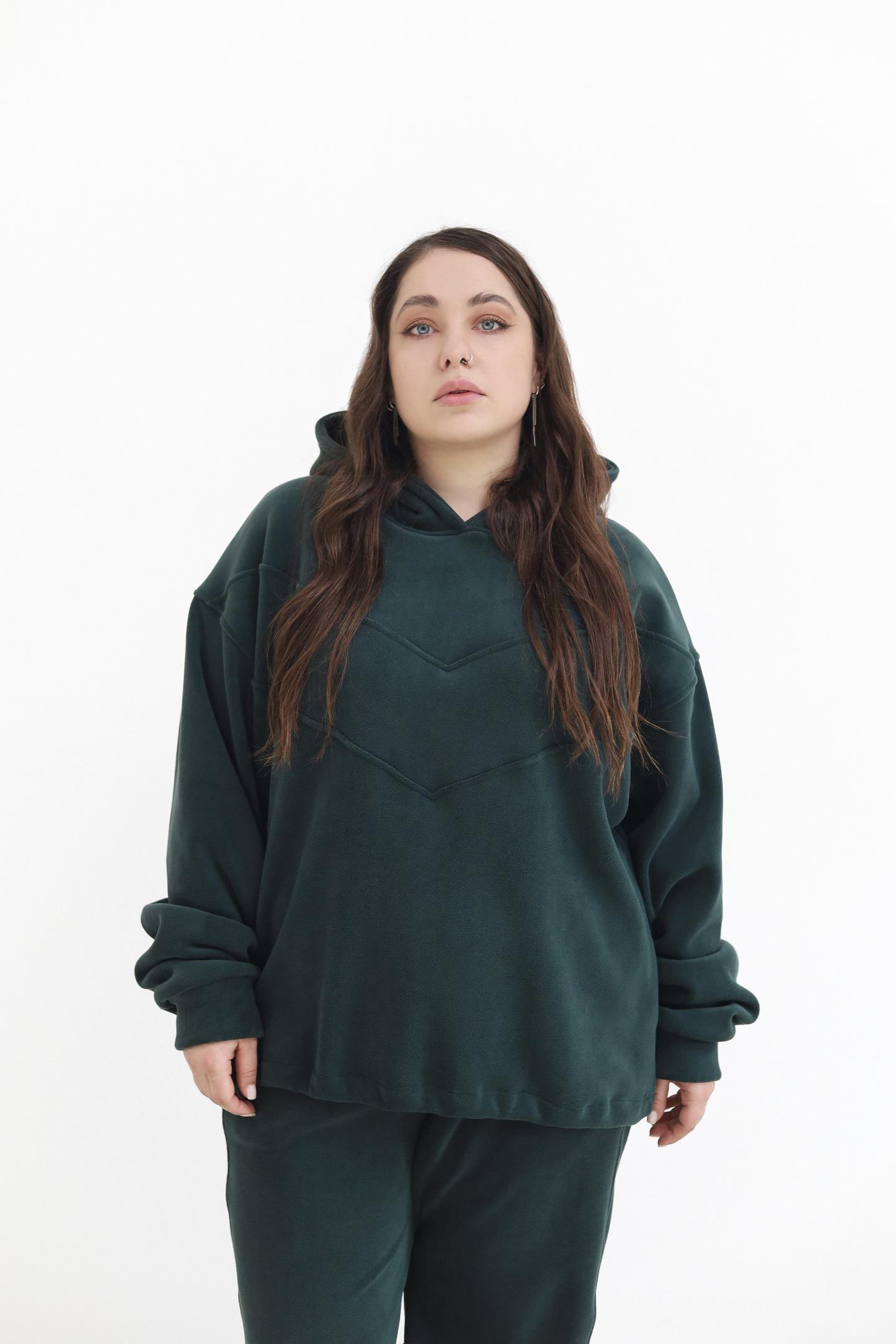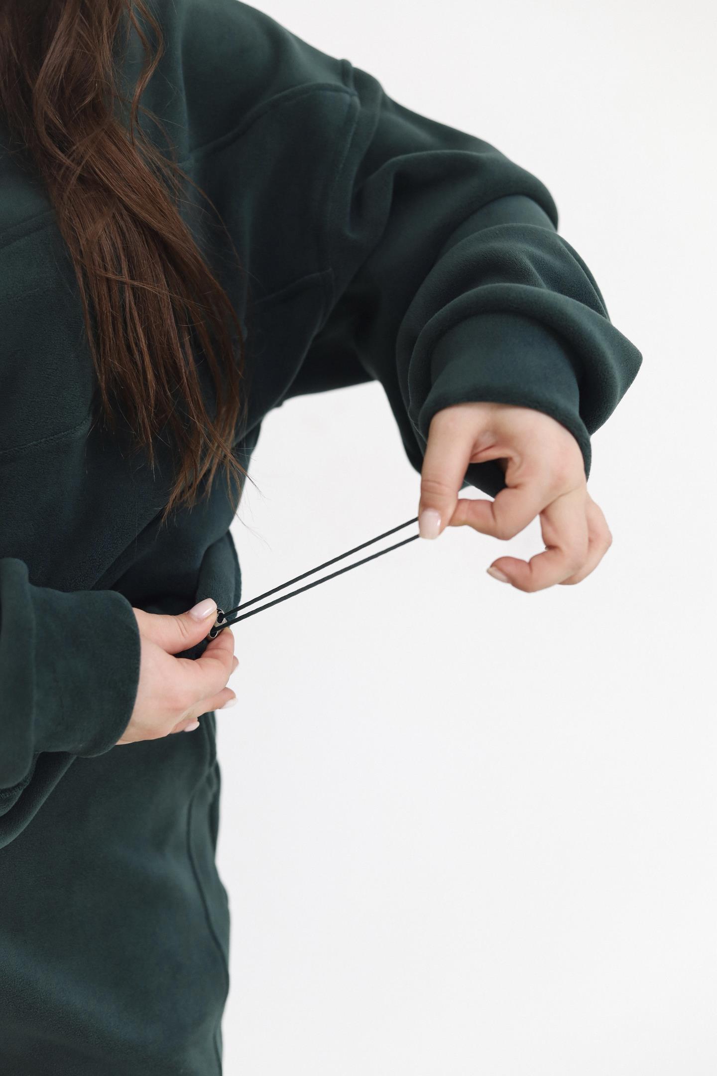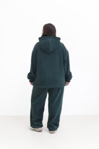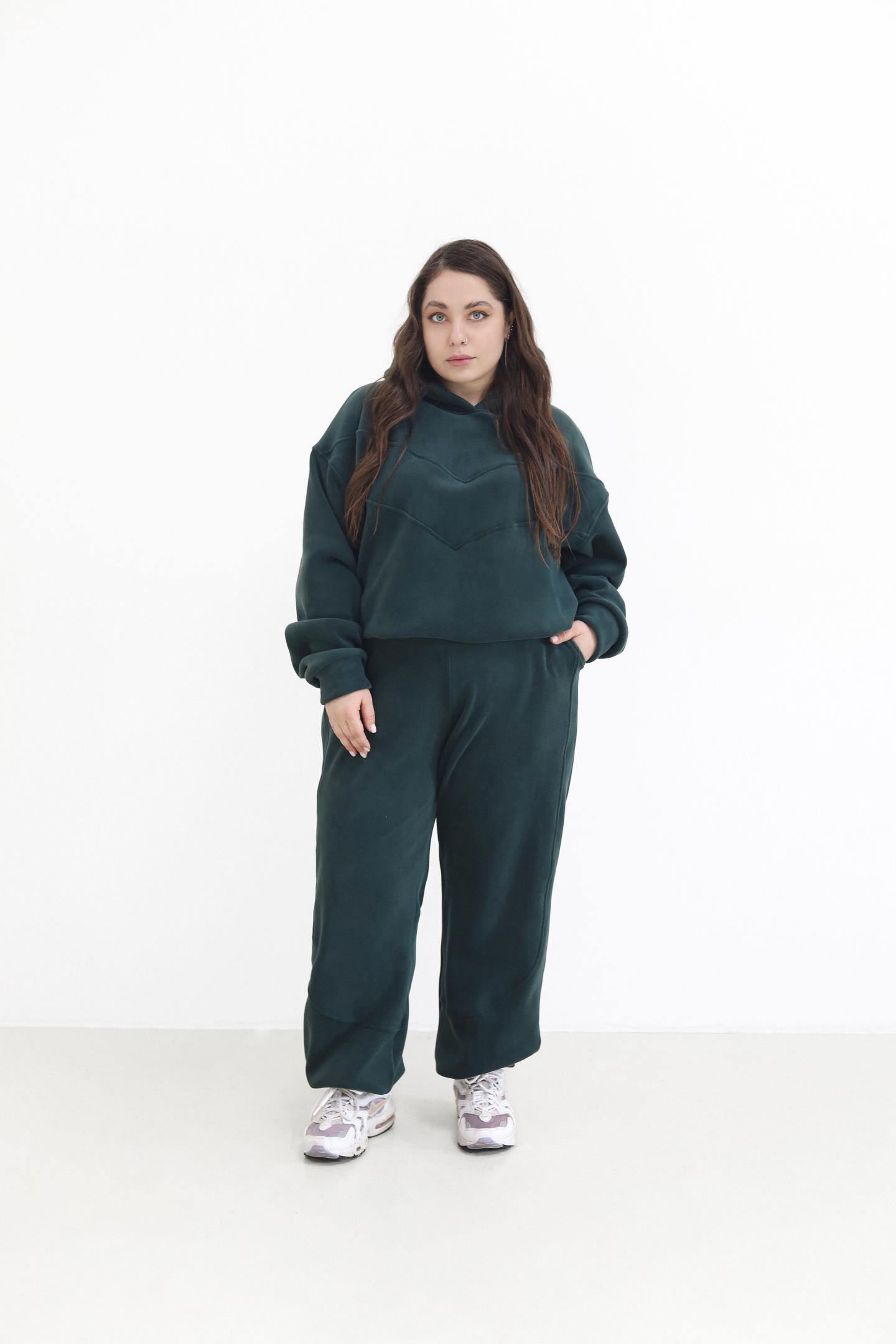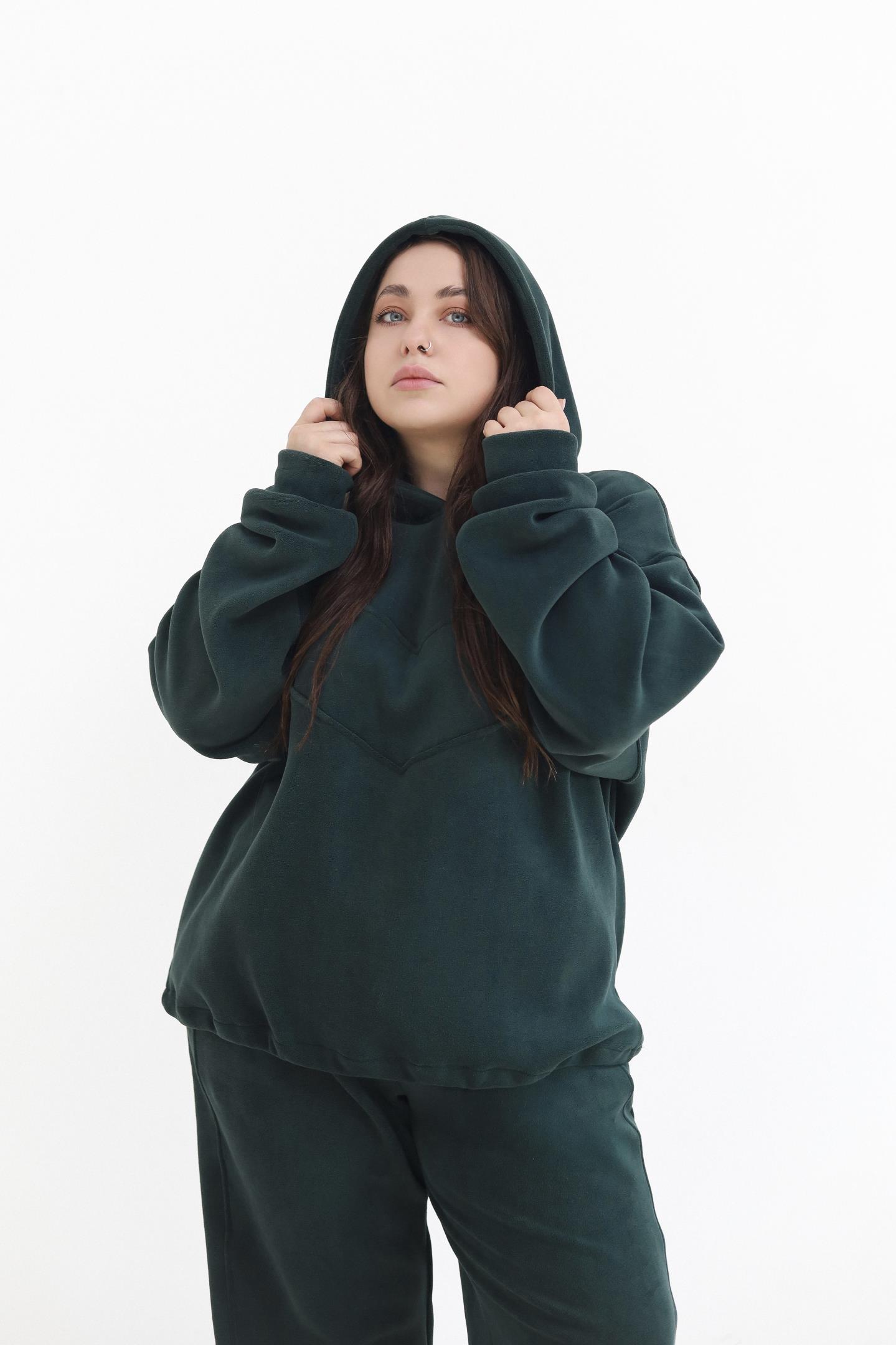 Жіночий костюм з флісу — теплий, м’який і неймовірно комфортний. Двостороння флісова тканина огортає затишком, а вільна оверсайз-посадка з капюшоном надійно захищає у прохолодну погоду. Універсальний комплект для щоденних прогулянок і стильних casual-луків.